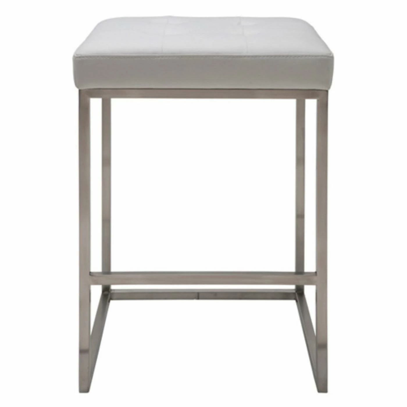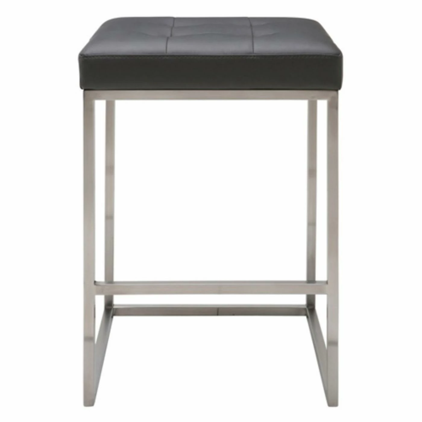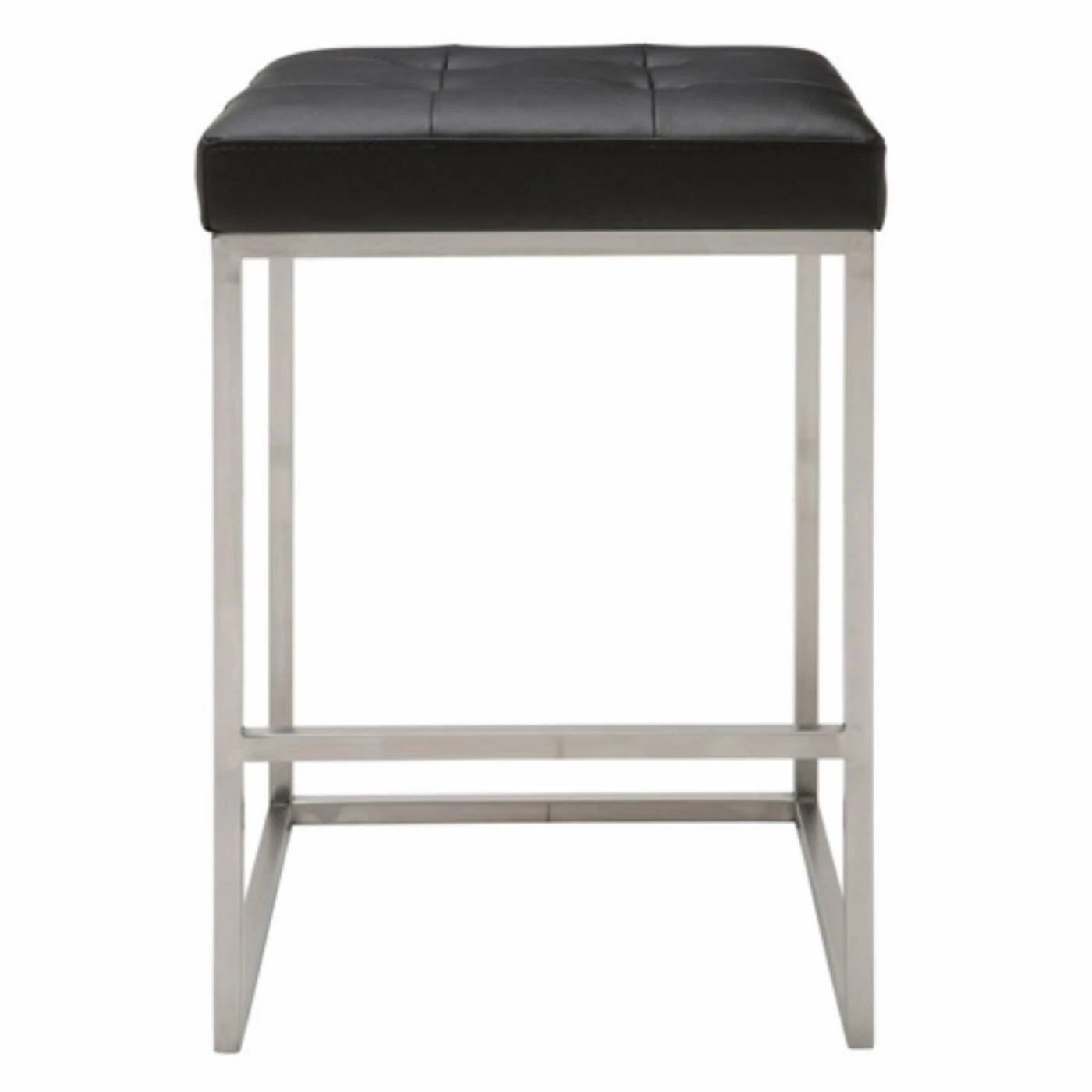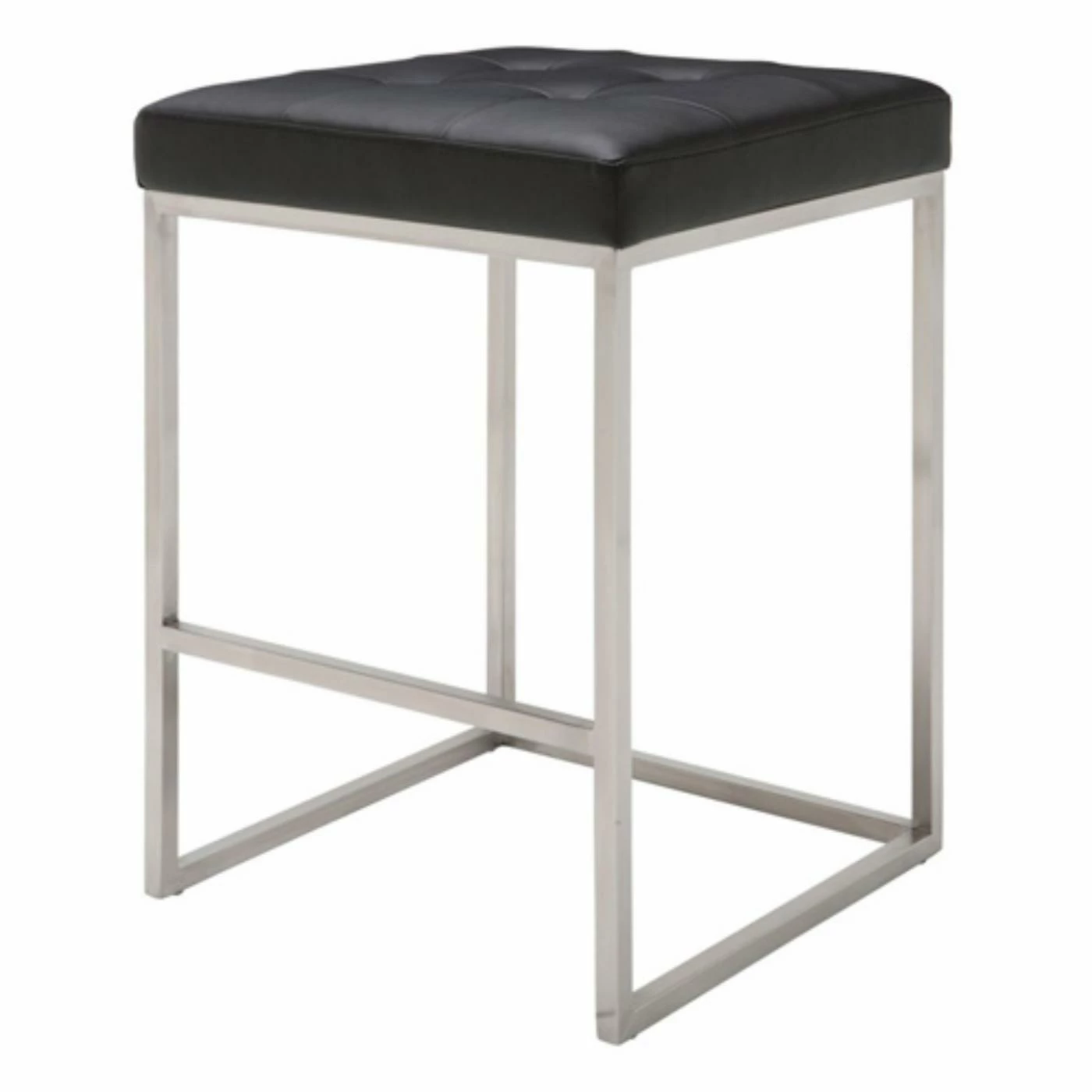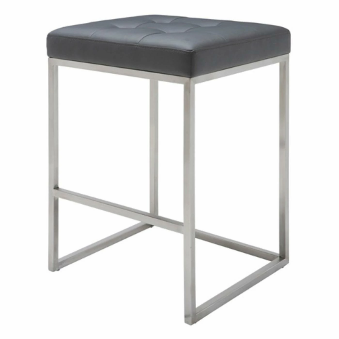 Comfort with modern minimalist design, you’re going to love the Nuevo 25.75 in. Chi Counter Stool – Set of 2. Just what your eat-at counter needs, this set includes two backless stools with angular brushed stainless steel frames. Perfectly placed footrests and tufted naugahyde upholstery seats make them comfortable. Available in your choice of color.