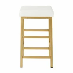 The clean lines and classic finish of the OSP Home Furnishings Metro 26 in. Gold Backless Counter Stool complete your kitchen with added elegance. The metallic finish of the base brings a touch of glamour, while padded legs and footrest bars bring in the practicality. A padded and fully upholstered seat in wrap-around faux leather with visible stitching as an accent pulls the long clean lines together. Backless, non-swivel styling is a classic, marrying comfort and practicality at your counter, high-top table, or as extra seating on a patio or sun porch.