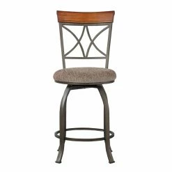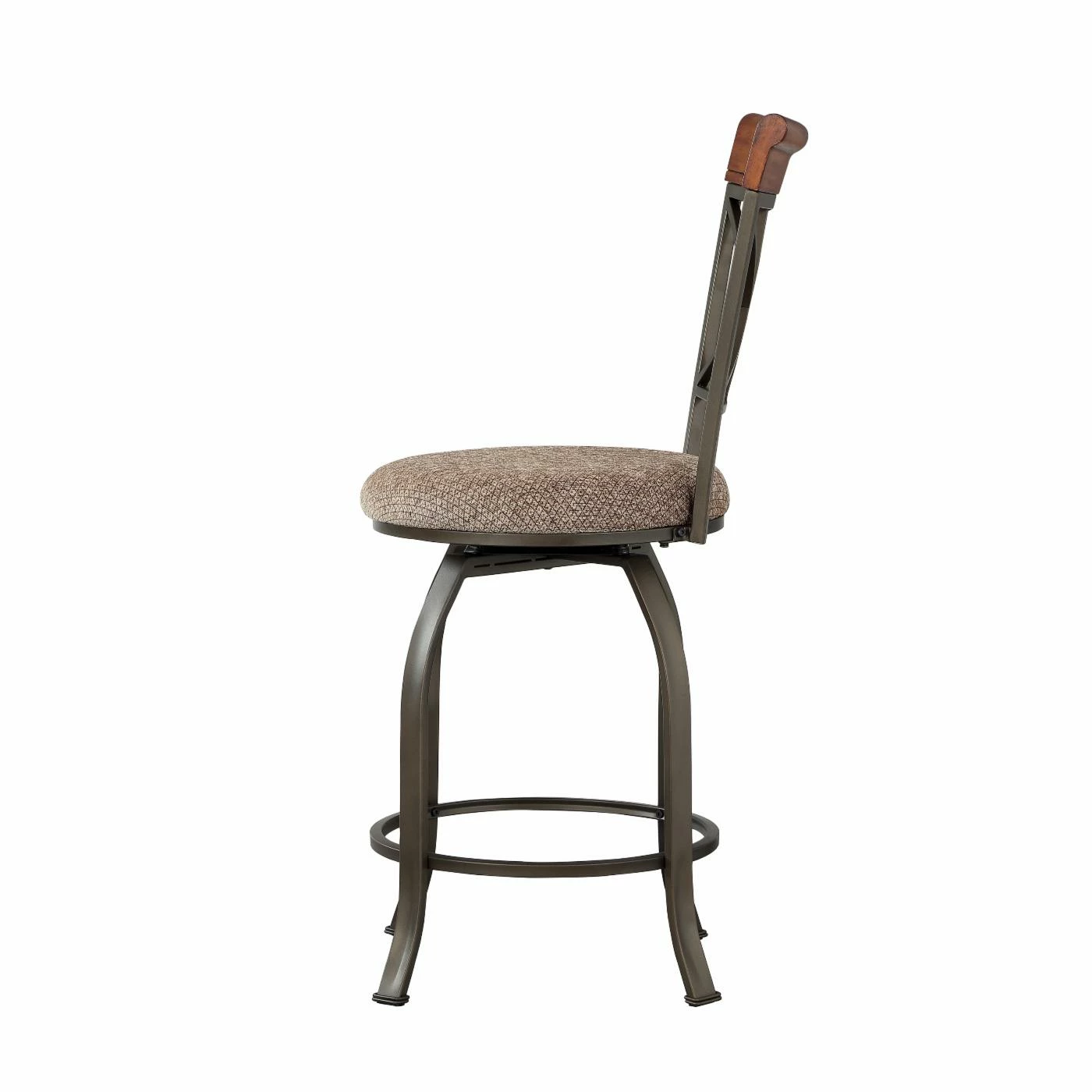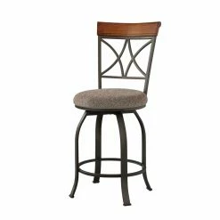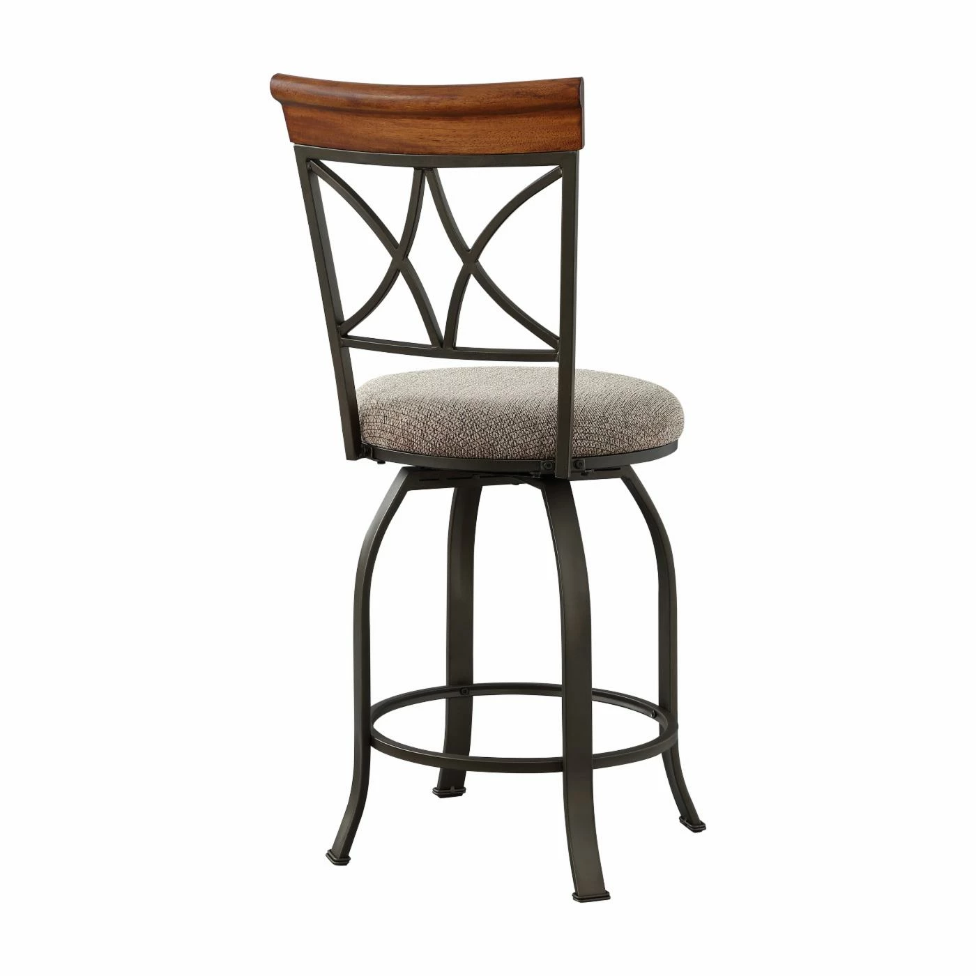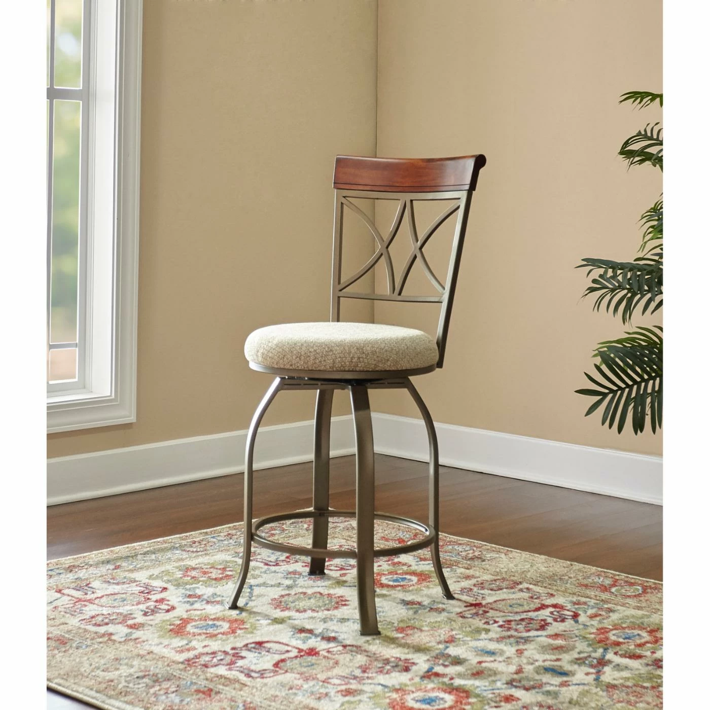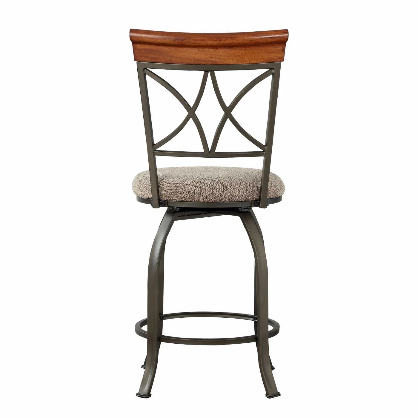 Blending modern metal with touches of fabric and wood, the Powell Hamilton Swivel Counter Stool can complement virtually any decor scheme. The stool’s sturdy metal frame ebbs and flows through gently curved legs and a diamond back design, while the wood top showcases a brushed faux medium cherry finish. Measuring 24 inches high, the round seat is padded and upholstered in 60% cotton/40% polyester fabric. The diamond-patterned taupe fabric coordinates easily with most color schemes, and the swivel feature adds even more flexibility as you add this stylish armless counter stool to your kitchen or home bar. Please note: This item is not intended for commercial use. Warranty applies to residential use only.