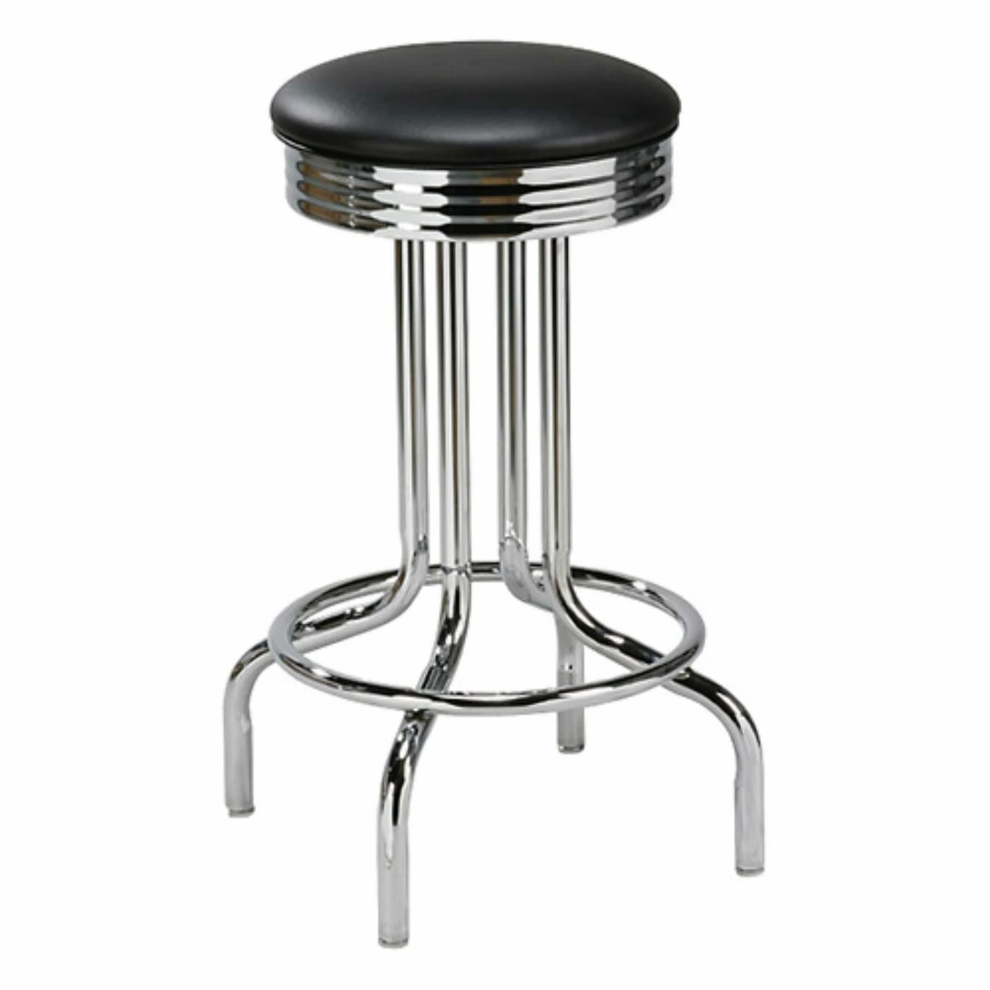 Set our Regal 26-Inch Fairfax Retro Backless Swivel Counter Stool at your counter-height table, breakfast bar, or soda shop counter for a classic look that will evoke fond memories in your guests. It’s an easy way to add timeless style to your home or establishment. Constructed with an 18-gauge steel frame with brilliant polished chrome finish, this stool’s comfy padded seat is upholstered in durable vinyl in your choice of black, sand, or wine. It’s sure to be a hit in any classic or retro setting. Dimensions: 21 diam. x 26H inches. Seat height: 26 inches.