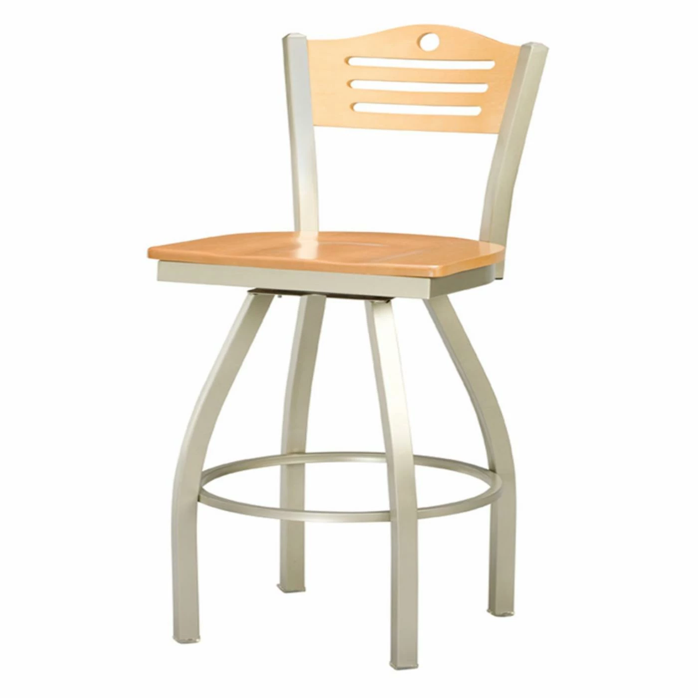 Finish the look of your table setting or counter front with the contemporary appeal of the Regal Liberties Slat Back 26 in. Swivel Metal Counter Stool with Wood Back. This stool is made with a steel frame and finished with a contrasting seat and back. Its swivel feature offers comfort and convenience while its curved legs and cut out accents give it a look welcome in any setting. Choose from finish options to best fit your dΓ©cor.