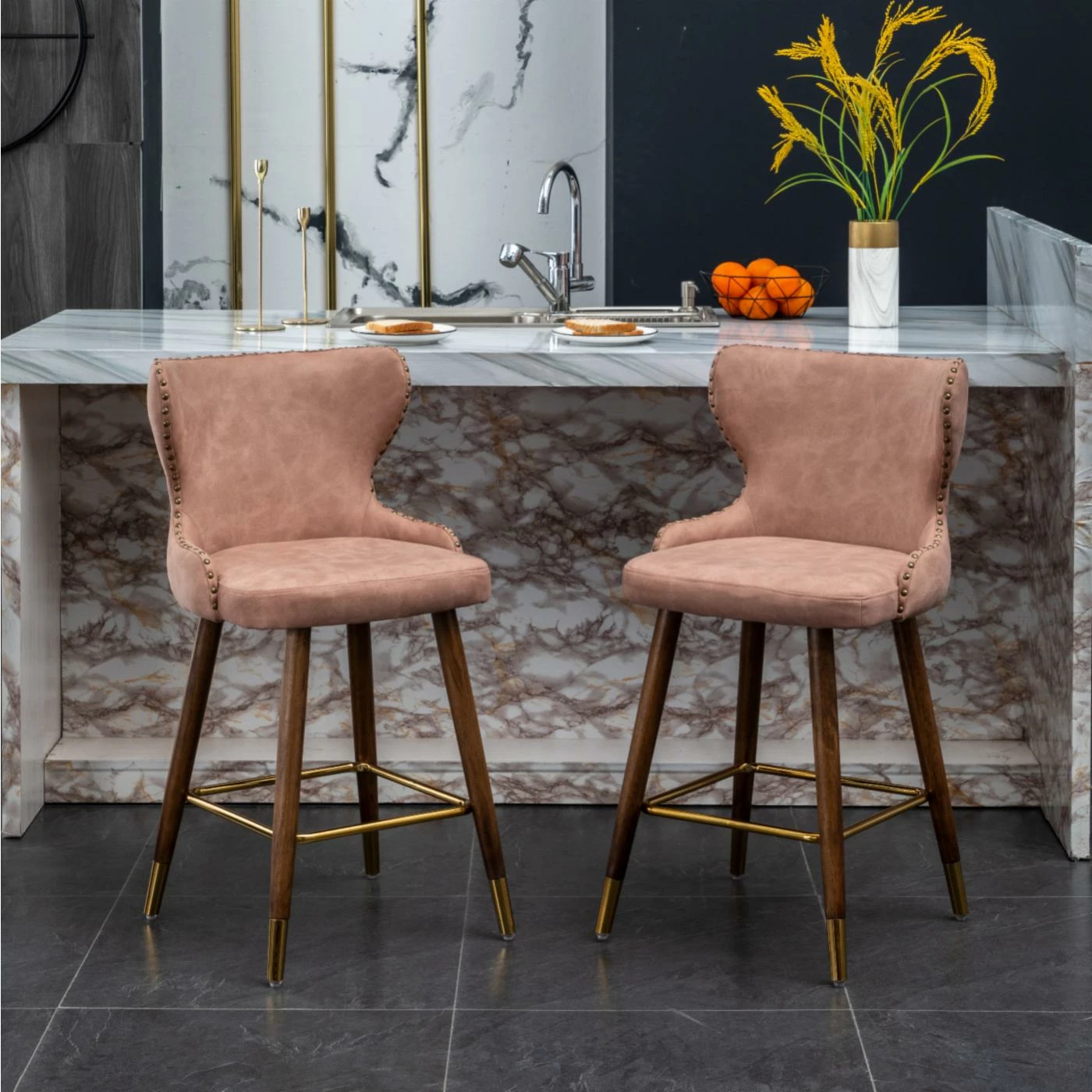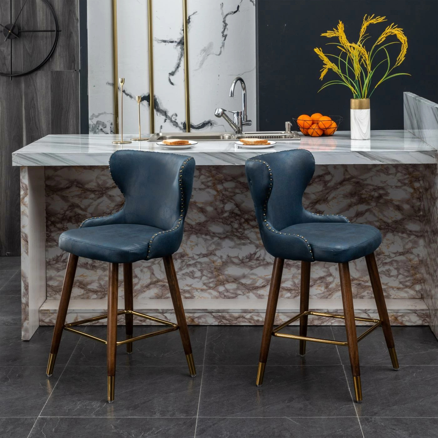 - The set includes two counter height stools