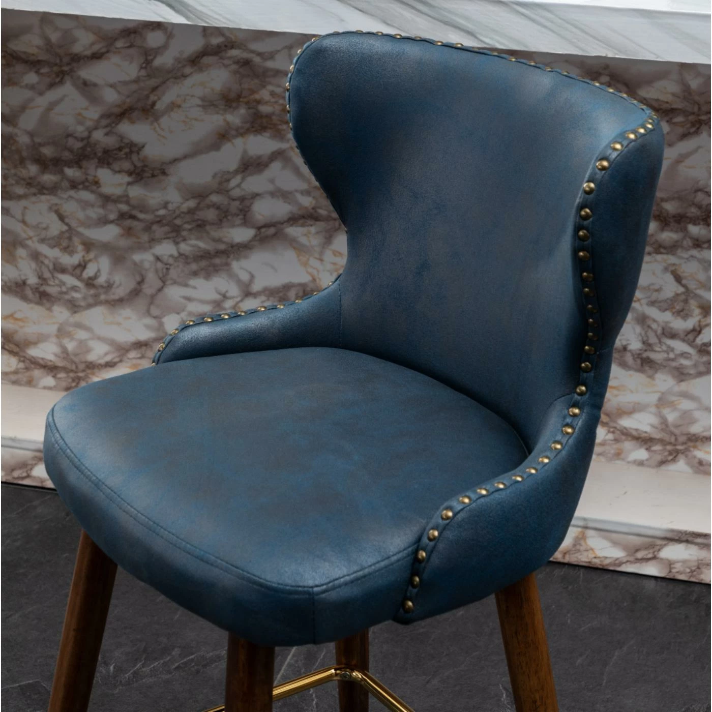 - Curved wing-back seat with nail head trim