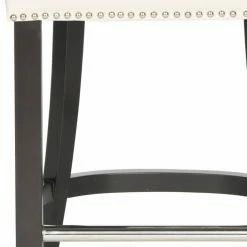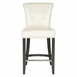 A bright, over scaled ring and polished nailhead trim give the Safavieh Addo 25.7 in. Ring Counter Stool its bold, contemporary appeal. This counter stool is upholstered in flat cream bicast leather and graced by a rolled back and generous seat. It sits on a birch wood frame in espresso with a U-shaped stretcher and metal footrest. Assembly required.