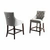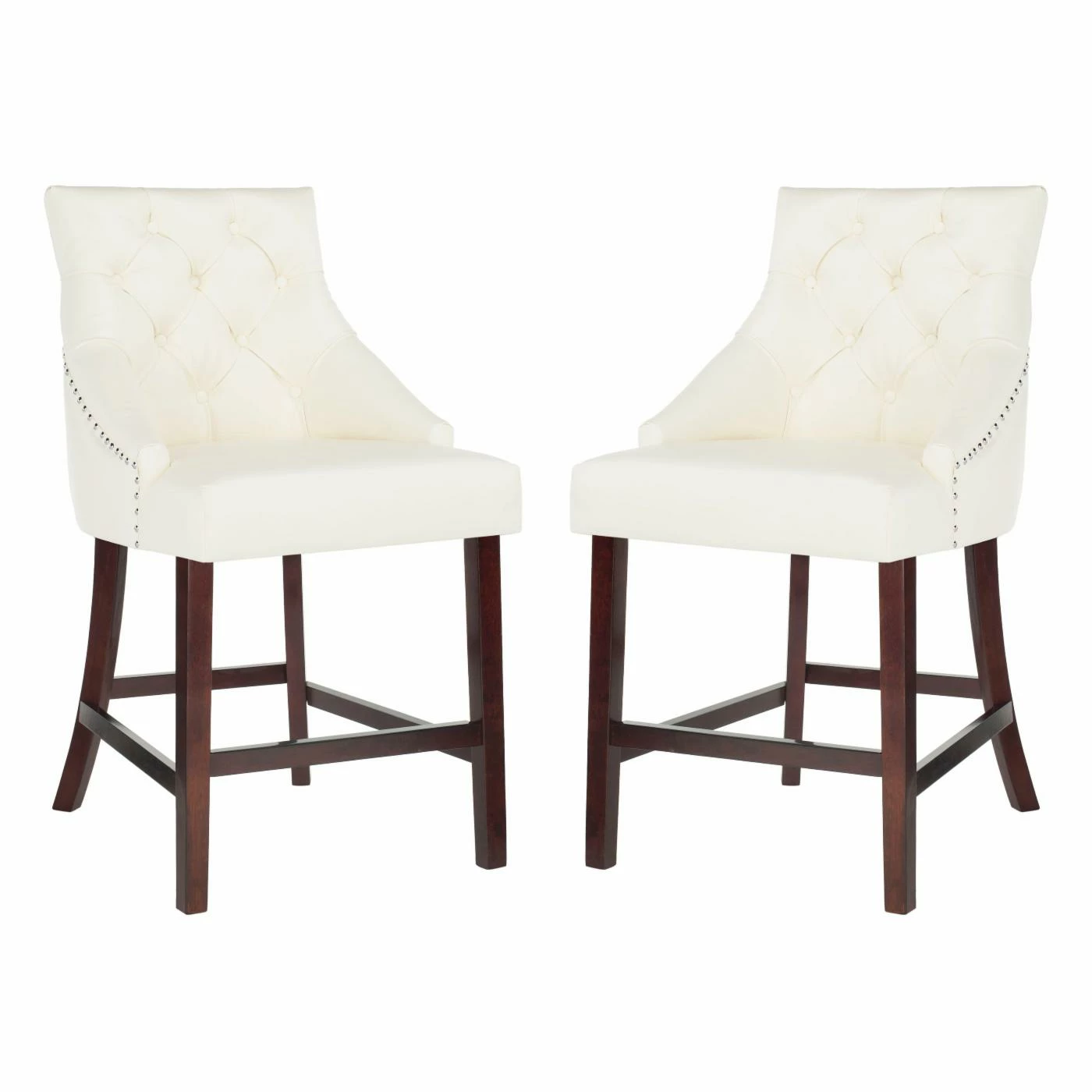Give your dining or bar area a refined look with the white Safavieh Eleni Tufted Wing Back Counter Stool – Set of 2. These stools are upholstered with a sleek faux leather and have button-tufting on the back of the inside, creating a diamond pattern. At the rear, there’s polished chrome nailhead trim and a matching hoop. The frames are crafted from wood, have stretchers for added support, and boast a rich mahogany finish.