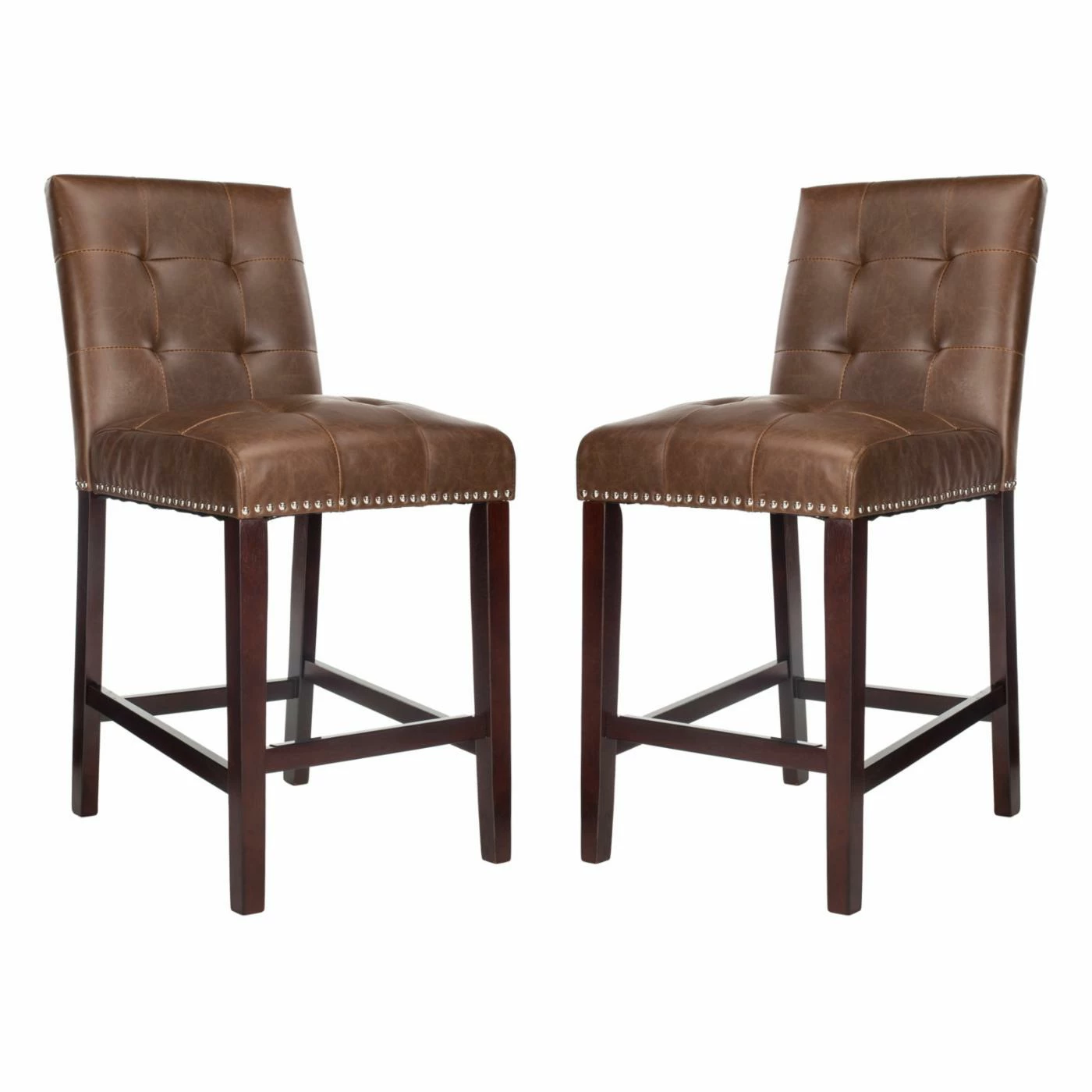 From its deluxe leather upholstery to its clean-lined contemporary style, the Safavieh Nikita Leather 26 in. Counter Stool – Set of 2 is a chic way to upgrade your counter-height dining table. The wood frame features a classic brown finish, and the upholstery is crafted of soft brown leather. Elegant details abound, too, including polished chrome nailhead trim and tufted accents on the seat and back.