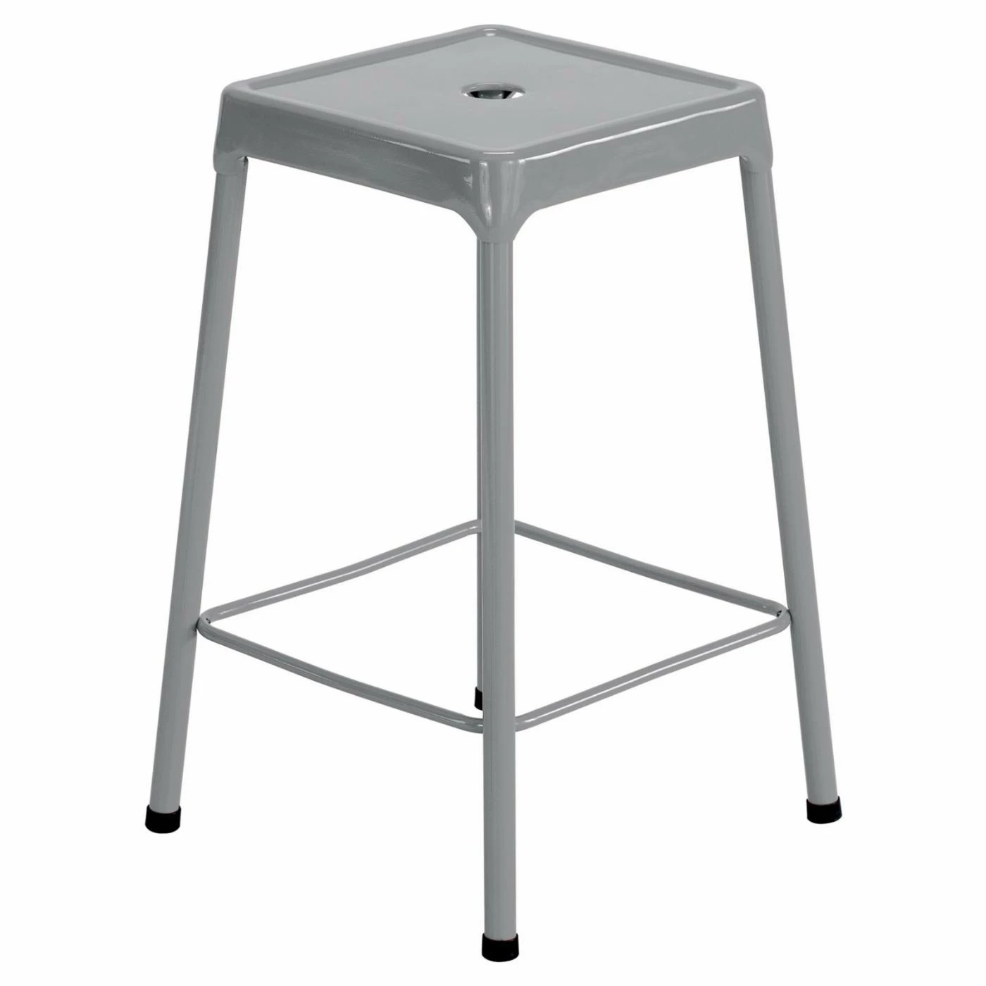 The Safco Steel Dining Stool is a fixed-height seating option perfectly suited for a workbench or table. The no-nonsense industrial design is crafted entirely from solid steel in an eco-friendly, glossy powder-coat finish, with select color options, and features a center hole for easy carrying and a foot ring for added balance. Nylon glides cap off the legs to protect floors. Some assembly is required.