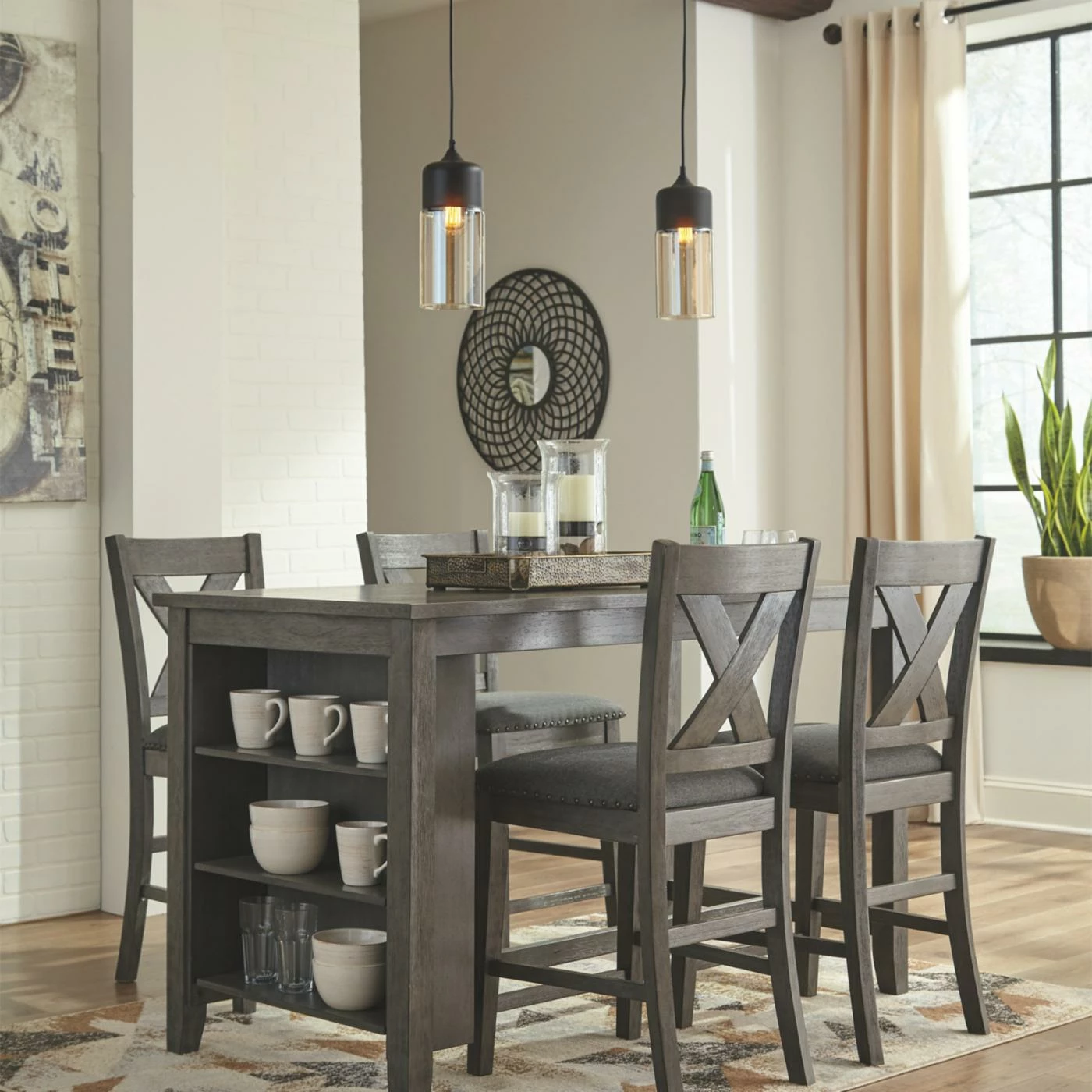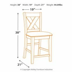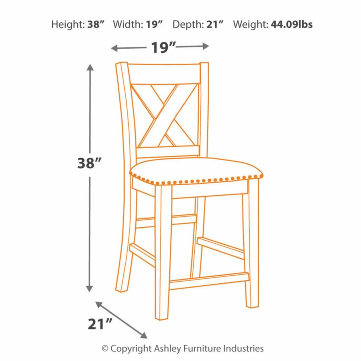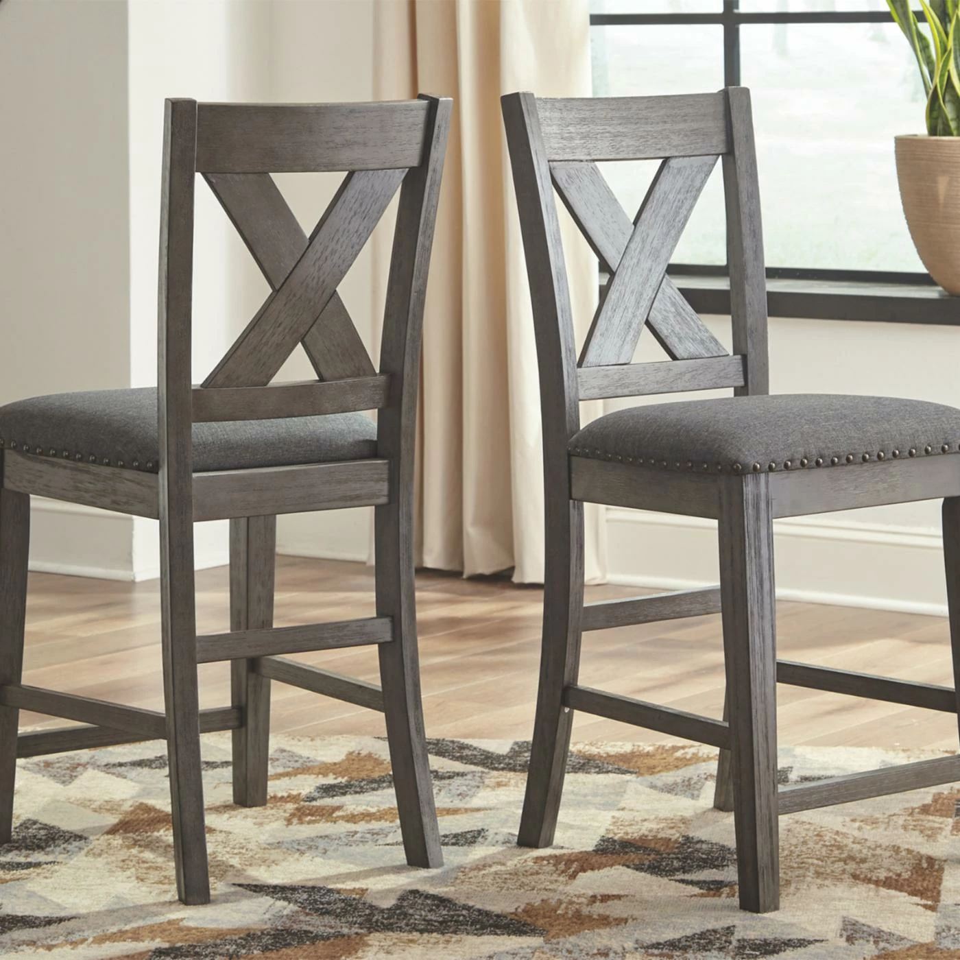 The Signature Design by Ashley Caitbrook 25 in. Cross Back Counter Stool – Set of 2 radiates easy, casual comfort and sleek design. Each of these counter stools sits on a sturdy frame that’s built of acacia wood veneers and solids for enduring use. The X-style back lends geometric interest and back support. Thick foam padding rests under the smooth fabric seat upholstery for maximum comfort.