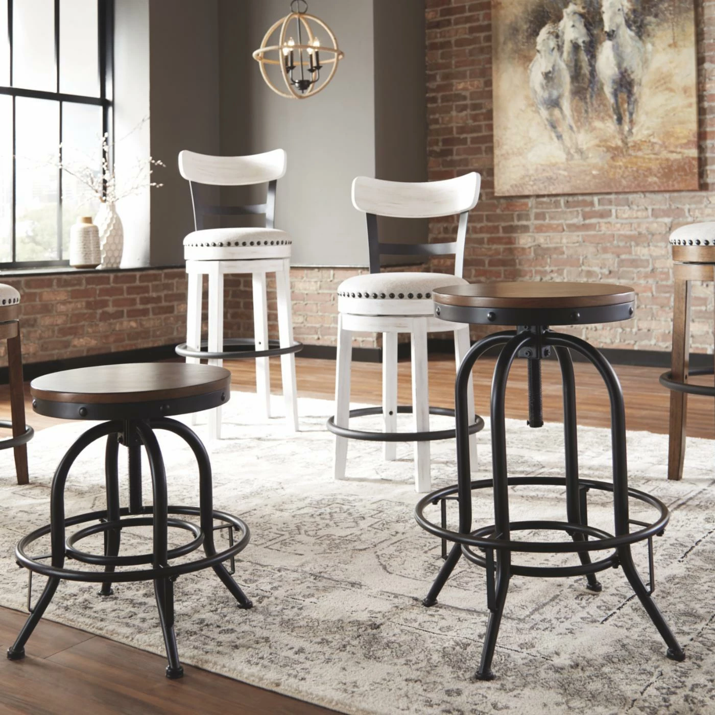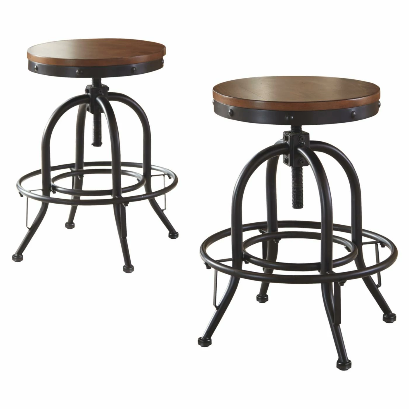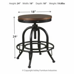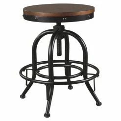 Introduce some stark industrial charm to your dining room or kitchen with the Signature Design by Ashley Valebeck 24 in. Backless Swivel Counter Stool – Set of 2. Two matching backless stools are included in this set, each built from rugged tubed steel with a black finish. Curved legs and a ring stretcher outfit the frames. The seats are made from thick wood, sanded smooth and finished in dark brown. The seats are designed to swivel fully and can be adjusted in height.