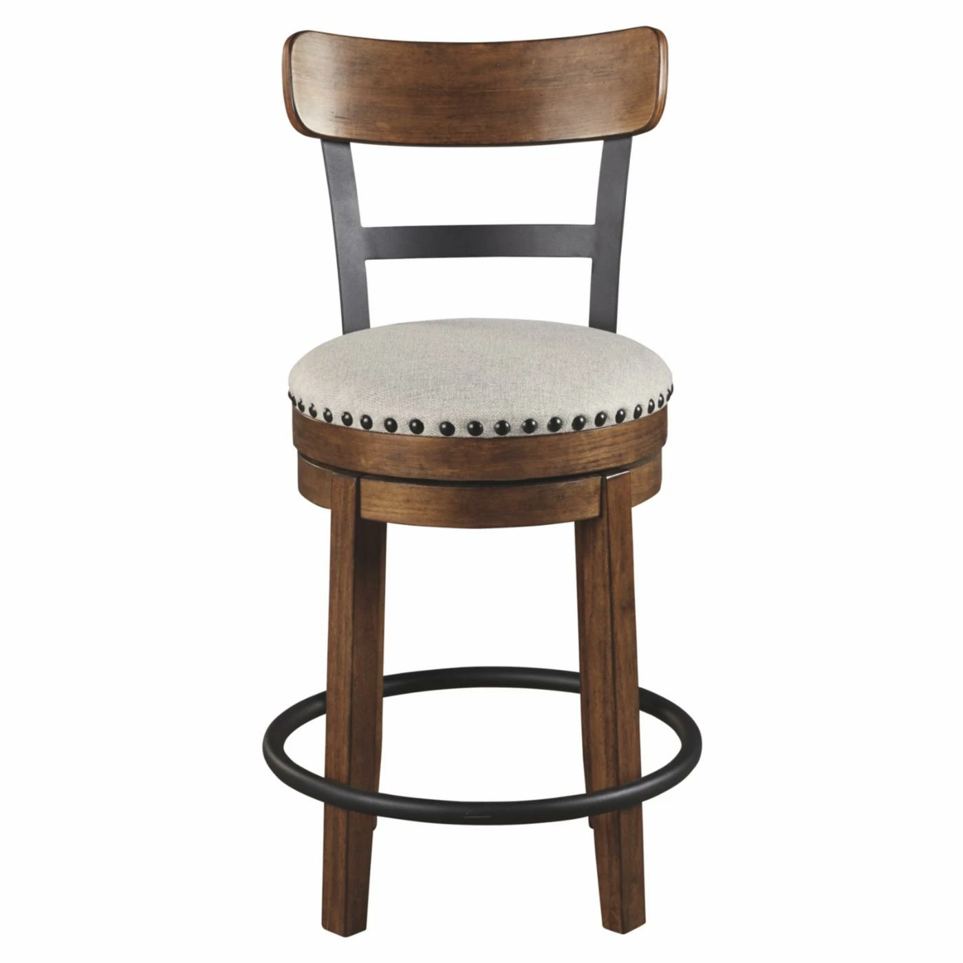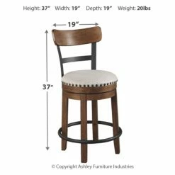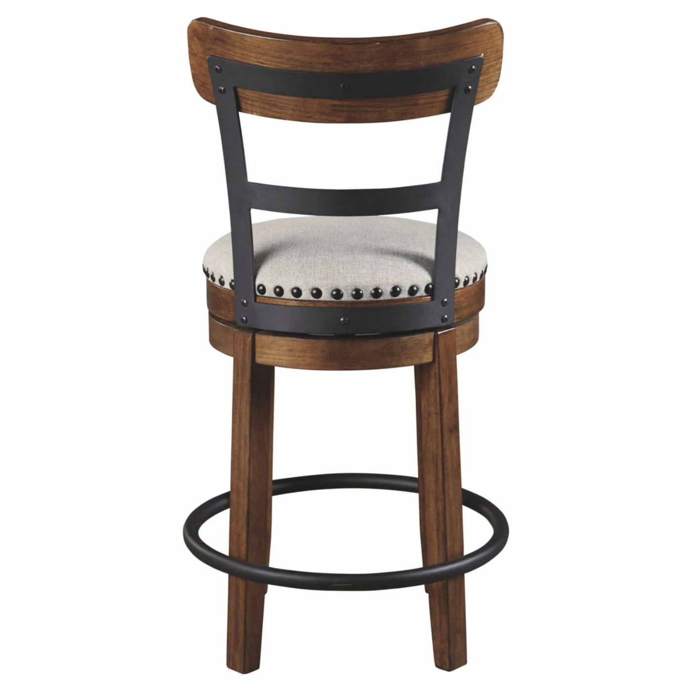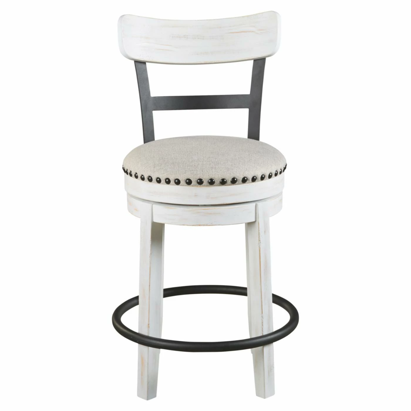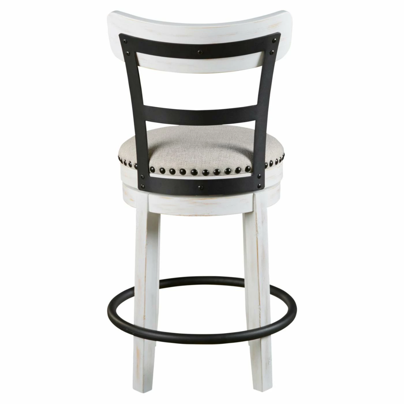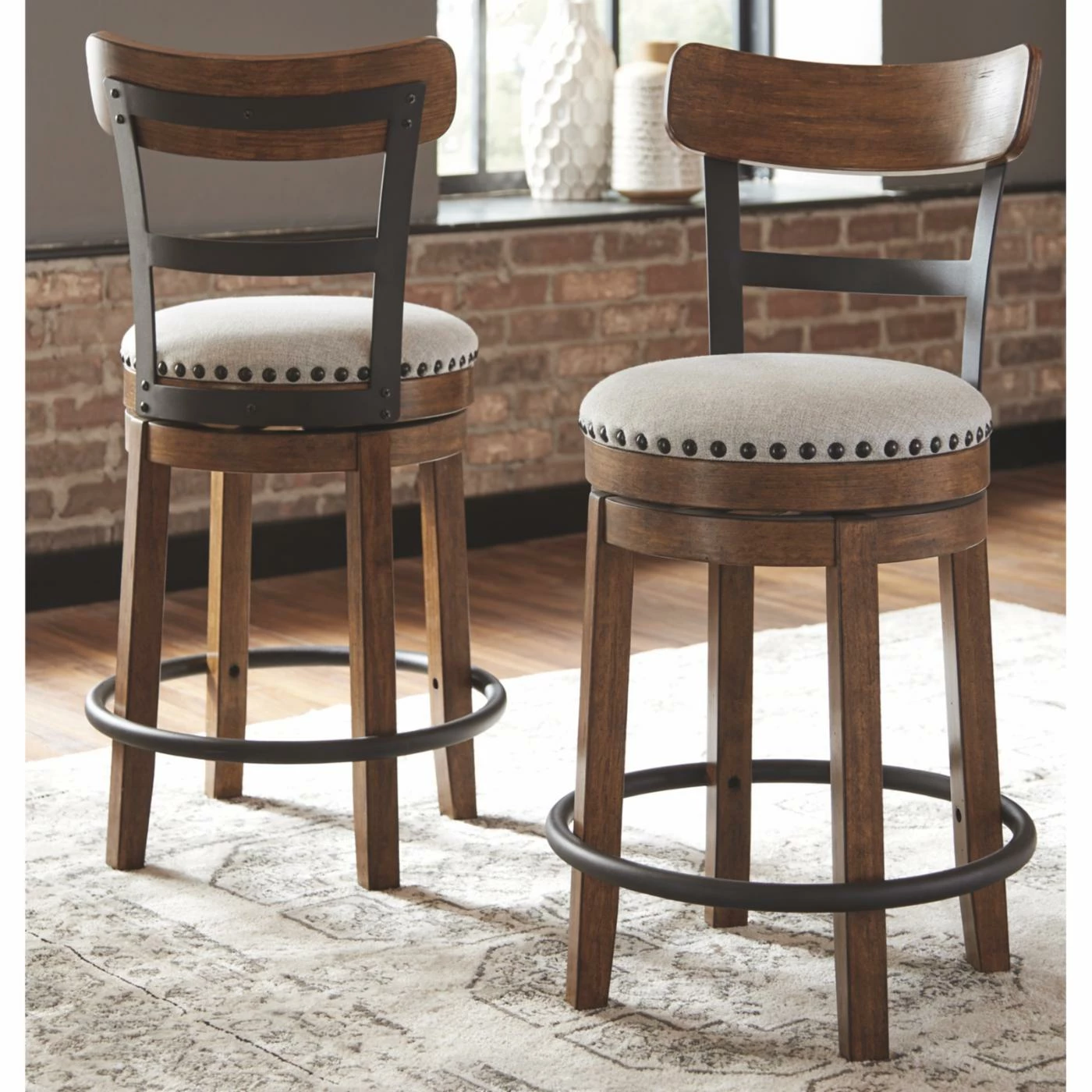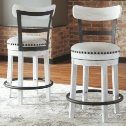 Make use of your kitchen counter or breakfast bar by outfitting it with the Signature Design by Ashley Valebeck 24 in. Ladder Back Nailhead Trim Swivel Counter Stool – Set of 2. Two identical stools are included in this set. Hardy engineered wood constructs the frames, perched on block legs. Black metal ladder-backs and ring footrests provide user support. Choose your preferred frame finish from the available. The seats come padded with foam and are upholstered in beige polyester fabric. Black nailheads stud the fabric. Seats swivel from side to side.