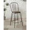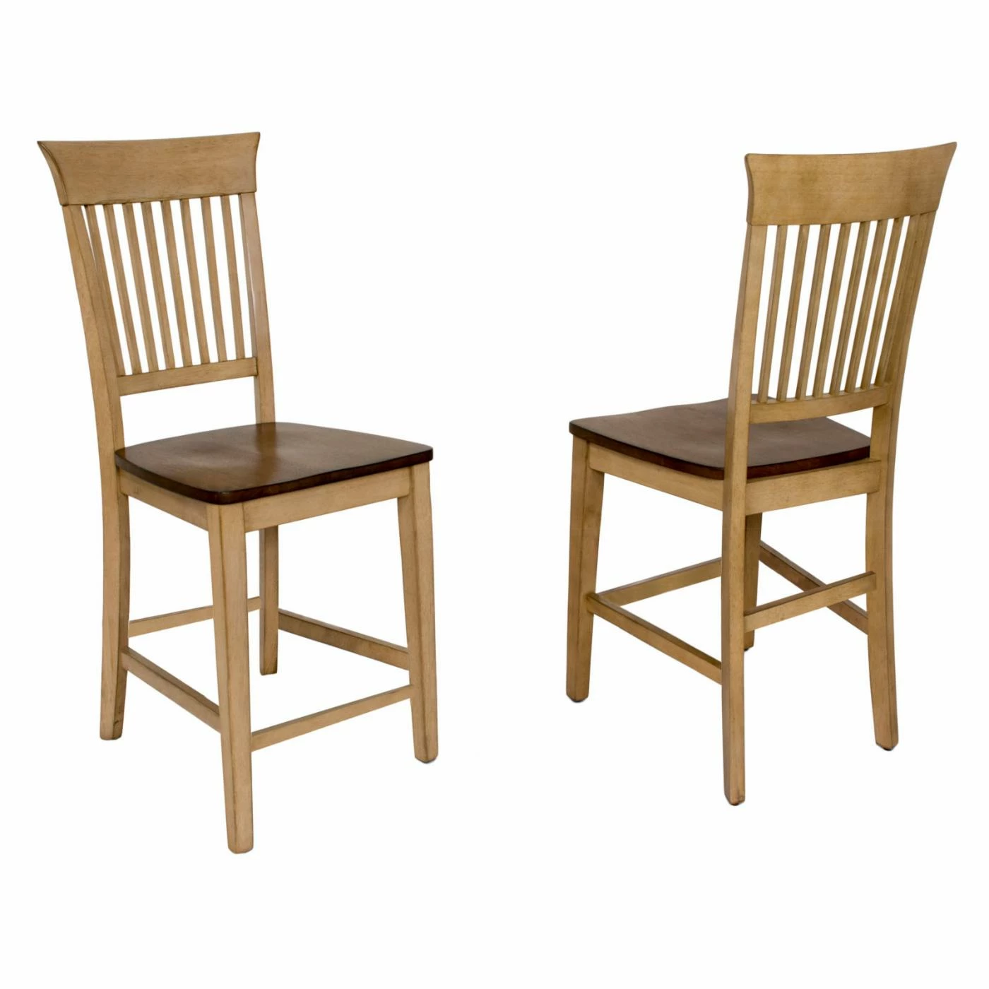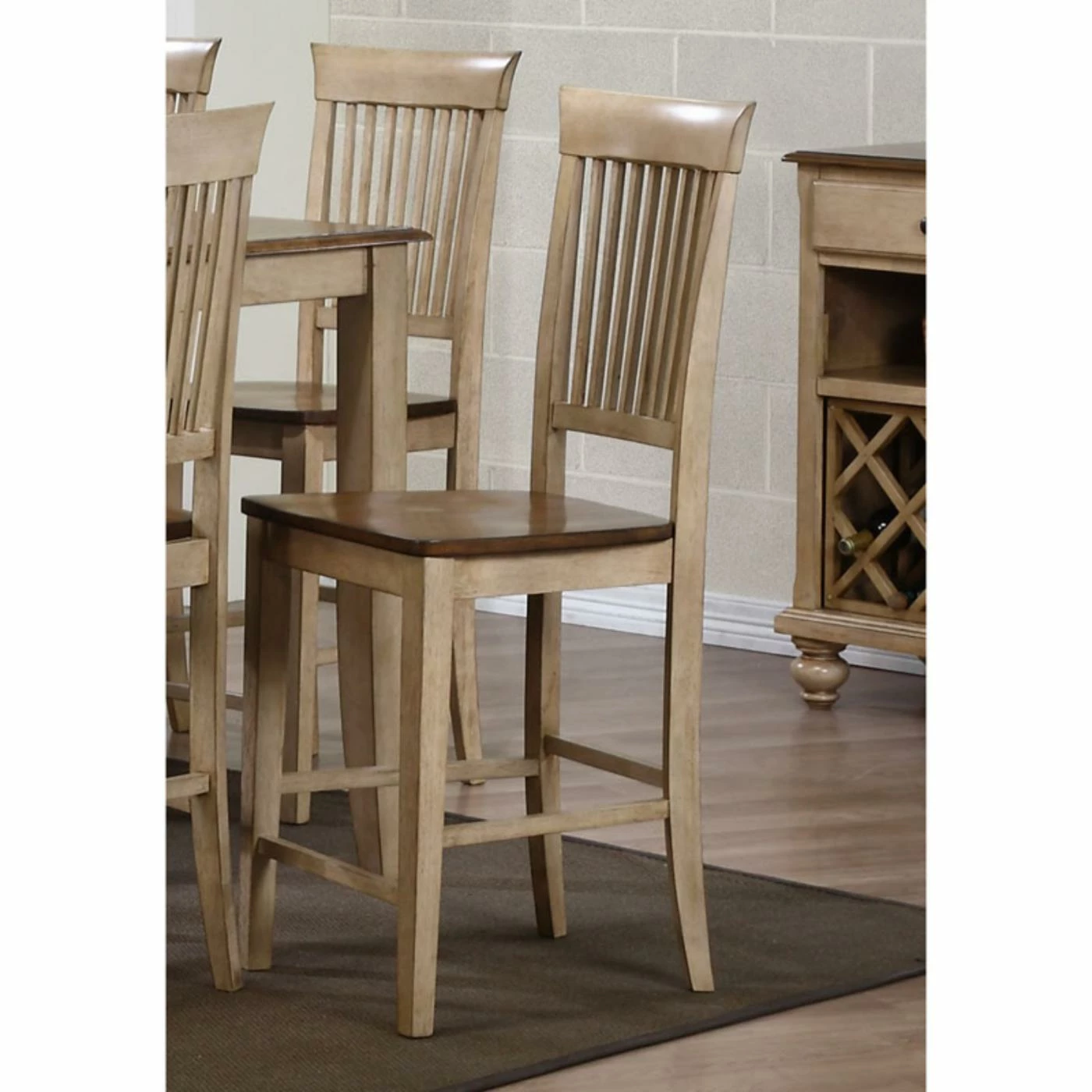 The fancy slat counter stool is crafted of eco-friendly Malaysian oak. It has a two-toned finish of distressed wheat on the frame and rich pecan on the seat for casual elegance. Its slim slats, straight front legs, and curved back legs call to mind craftsman design. The built-in footrests enhance your comfort.