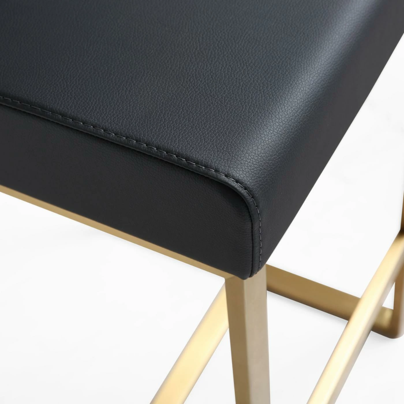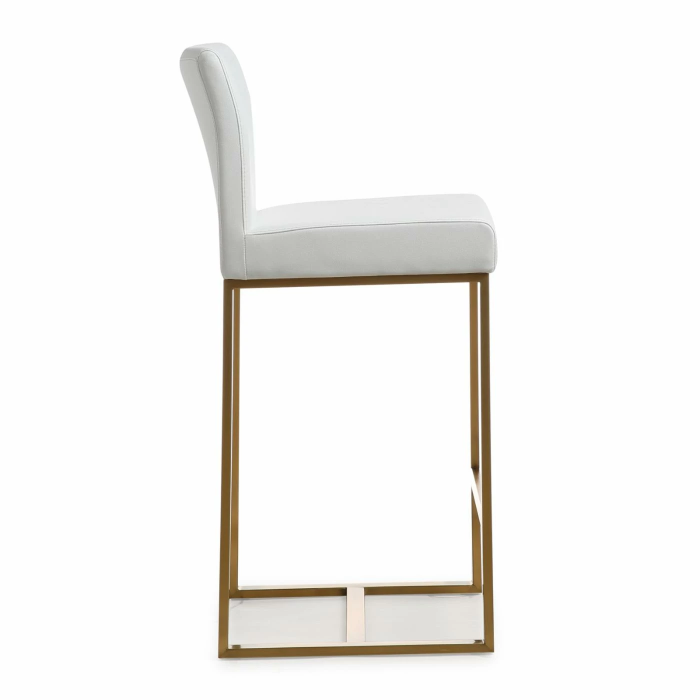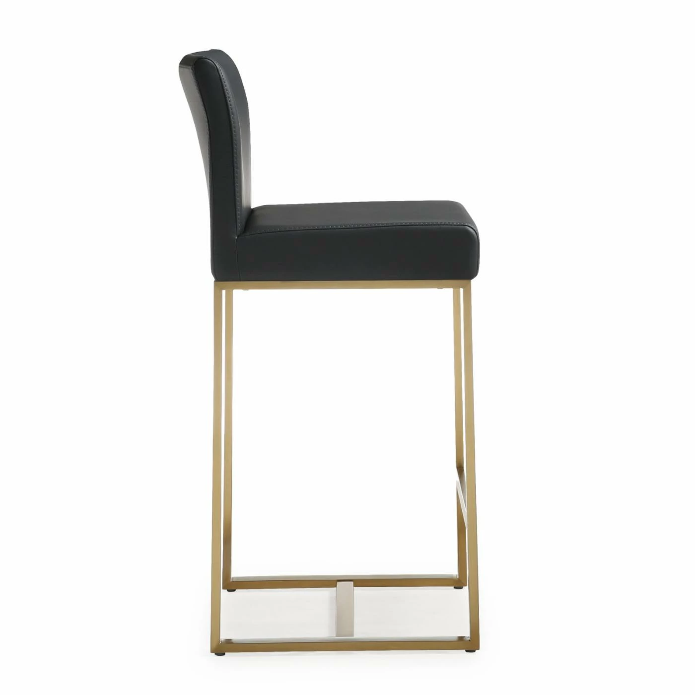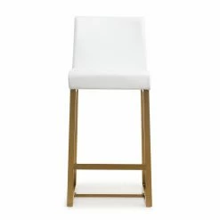Clean lines lend a modern look to the TOV Furniture Denmark Gold Steel Counter Stool – Set of 2, making it a sophisticated choice for a bar or kitchen area. This tall counter stool is elevated by a metal frame and legs finished in sleek gold. The smooth, supple eco leather upholstery and padded seat and back add comfort and contemporary style.
