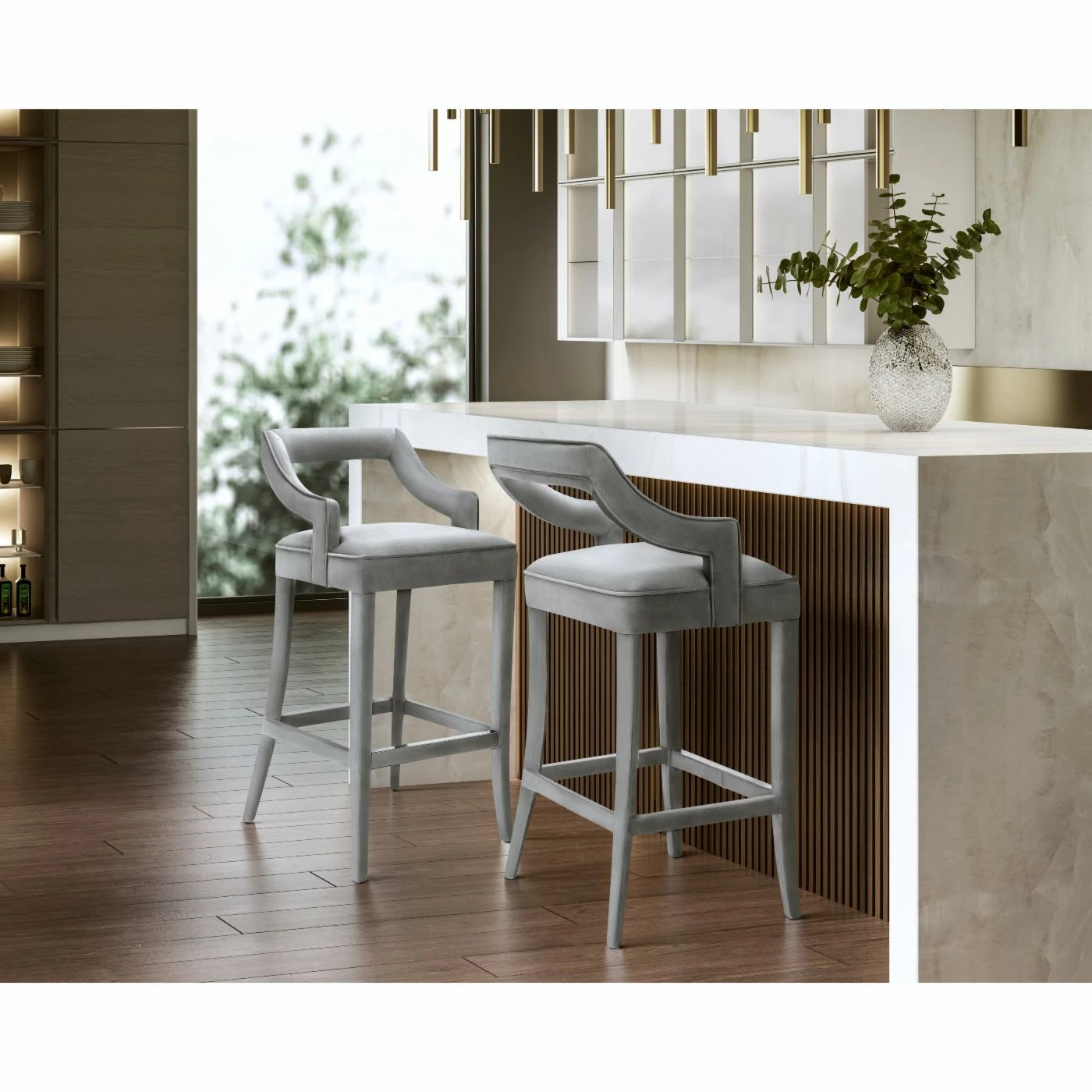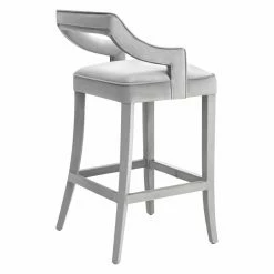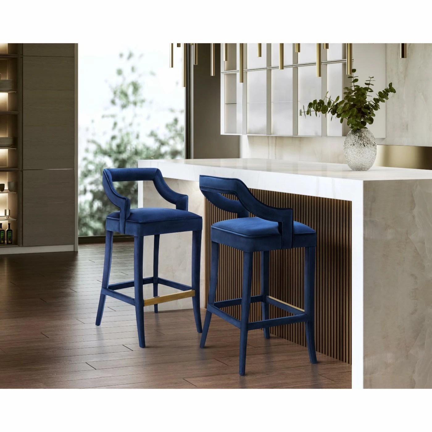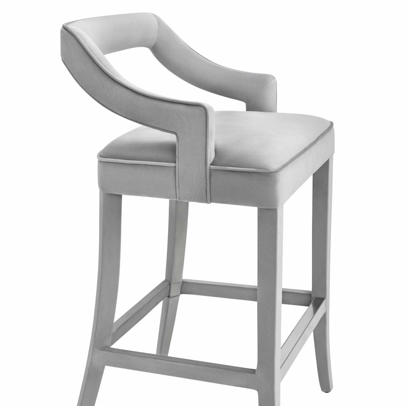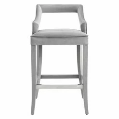 Reinvigorate your contemporary-style dining area with some stunning new seating, thanks to the TOV Furniture Tiffany Velvet 26 in. Counter Stool. This counter-height stool has an unmistakable profile with a horizontal backrest, with a floating look owing to the two curved armrests. The piece comes constructed from birch hardwoods and is wrapped in dense, soft foam for sitting comfort. The front footrest is crafted from metal with a brushed brass finish. High-quality velvet fabric upholsters the stool. Select your preferred color from the available options.