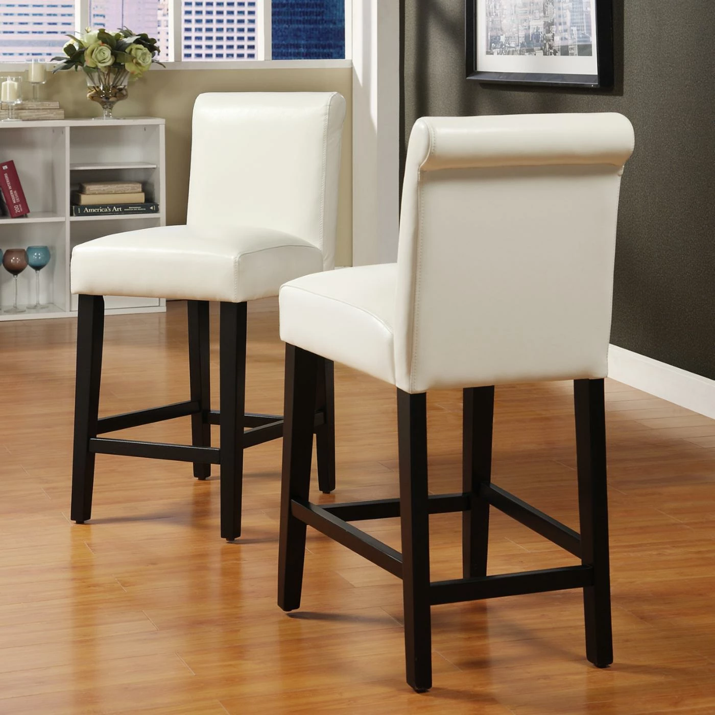 Curvy, rolled backrests contrast with squared-off legs in the transitional design of the Weston Home Arica 24 in. Faux Leather Counter Stool – Set of 2. These sturdy wood counter stools elevate breakfast bars and counter-height tables with their sumptuous, easy-to-clean faux leather upholstery. You can sit for hours comfortably on the polyester fill-cushioned, spring-suspension seats.
