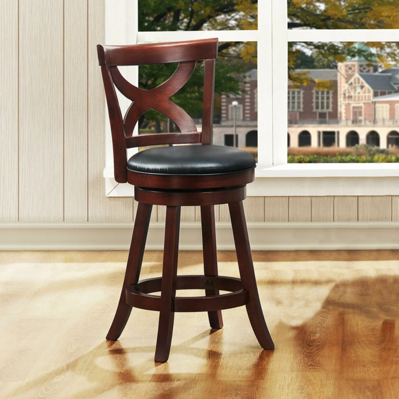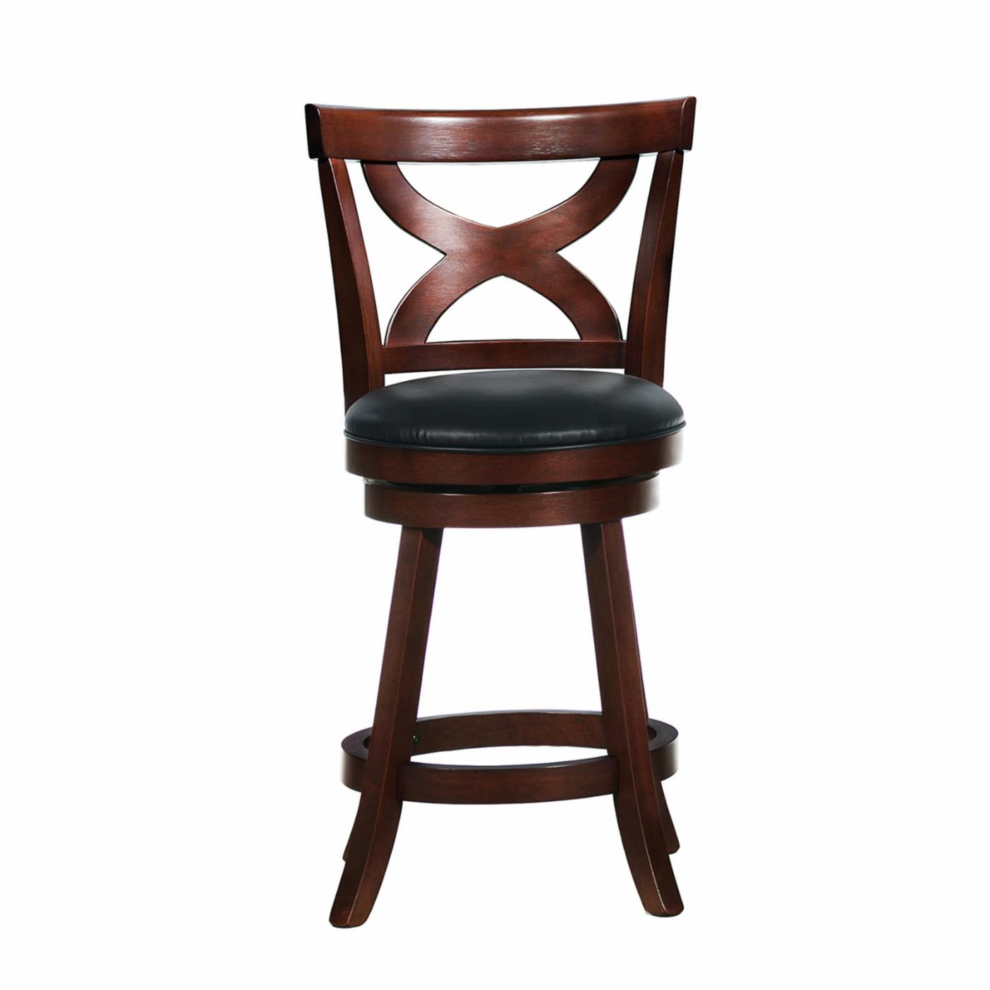 Contemporary style and a smooth swiveling feature make this Weston Home Basalt Counter Height Swivel X Back Chair – Dark Cherry just right for conversation area. Constructed of solid rubberwood in a rich cherry finish, this chair features a cushy seat in black faux leather and a curved X back design. Flared legs with built-in footrest and the swivel feature ensure comfort.