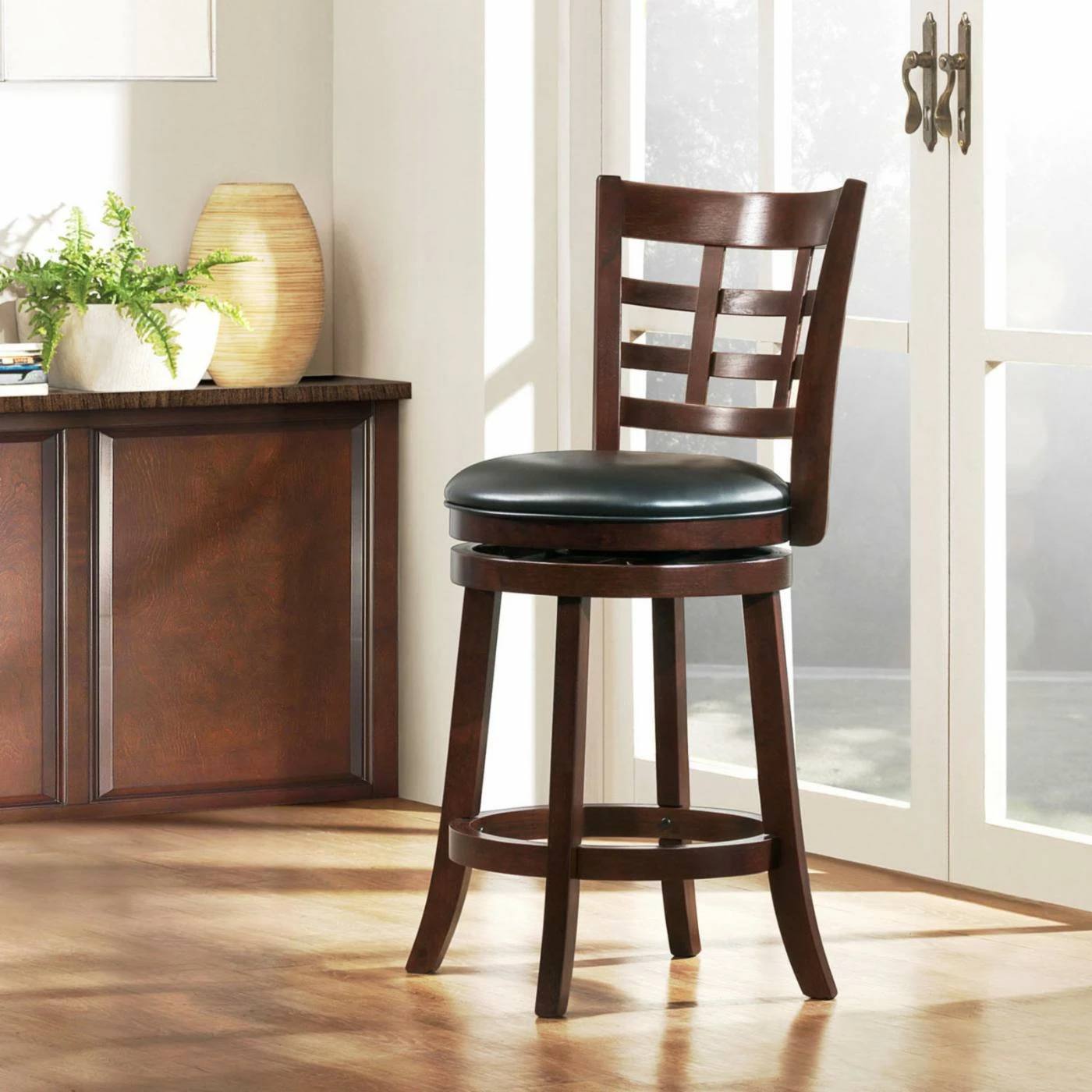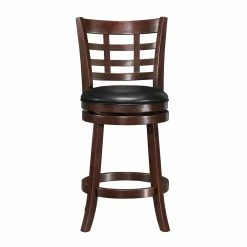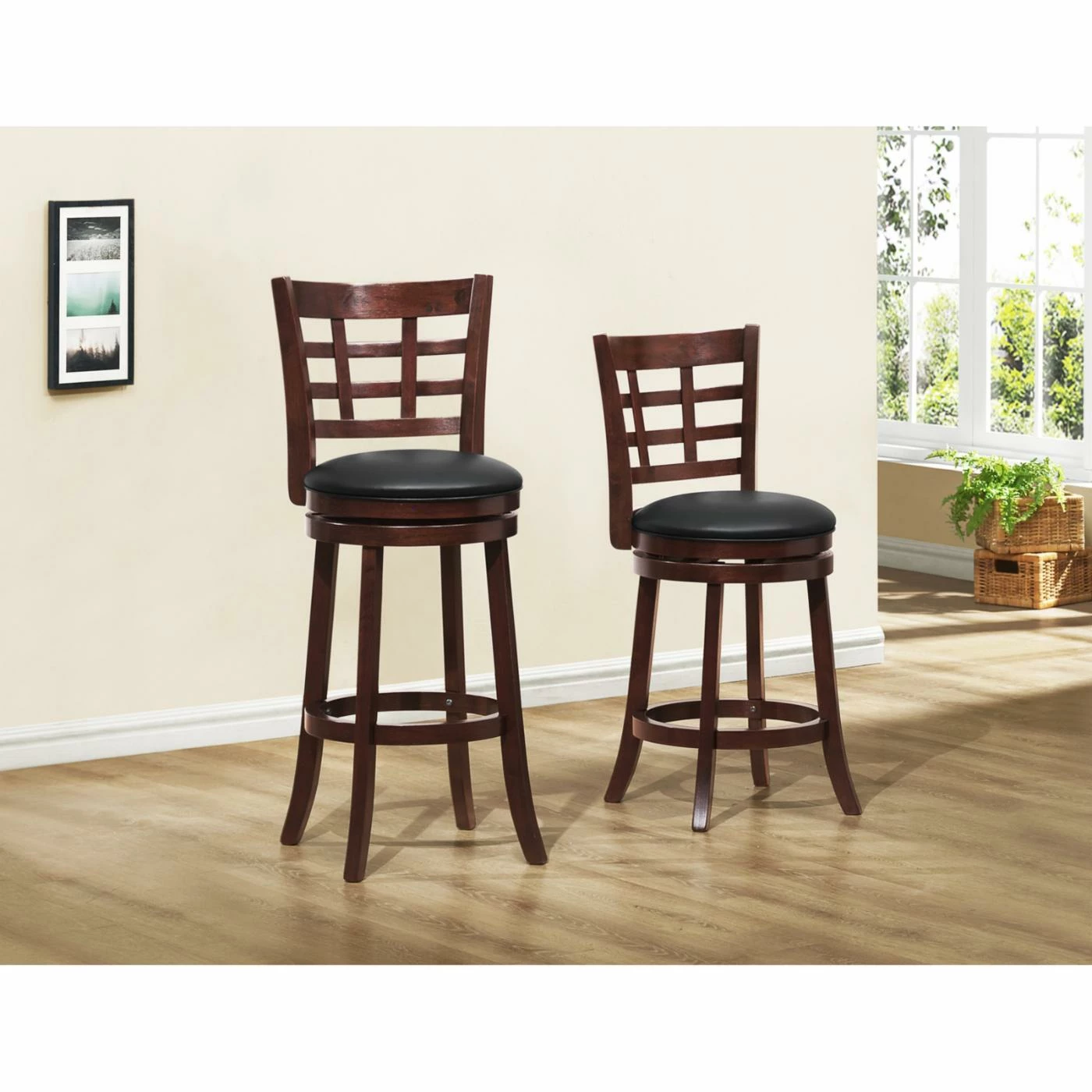 While countertops by themselves rarely make a fashion statement, a fresh, eye-catching counter stool like the Edmond Lattice Back Swivel Counter Stool can instantly enliven your counter space. This counter stool, crafted of durable rubberwood, is finished in a dark, versatile cherry color and is sure to draw the eye with its Mission-inspired lattice back and curved legs. Plus, the seat is super-comfy thanks to the black bi-cast leather upholstery and sweet swivel function. Order one or order many β however many you need for your space. Some simple assembly is required. Please note: This item is not intended for commercial use. Warranty applies to residential use only.