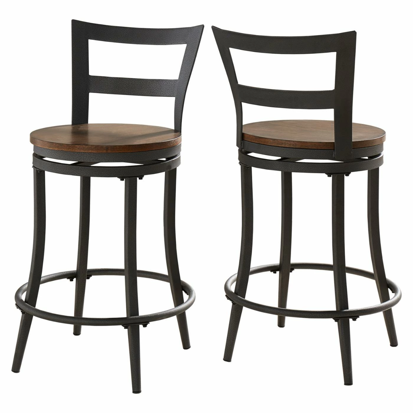 Heighten the rustic appeal of your kitchen, dining room, or breakfast nook with the Weston Home Mason 24 in. Swivel Counter Stool – Set of 2. Graphite metal frames give these two counter stools a rugged look and ensure lasting durability. Engineered wood covers the seats, adding a touch of warm, organic color. For comfort and ease of use, the stools feature swiveling seats and integrated footrests.