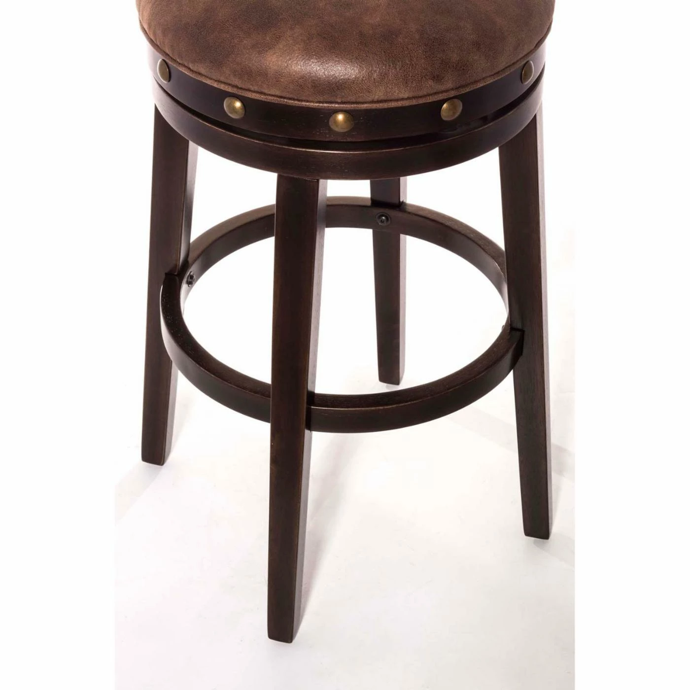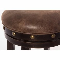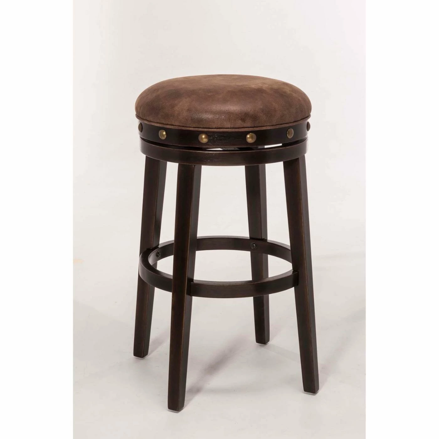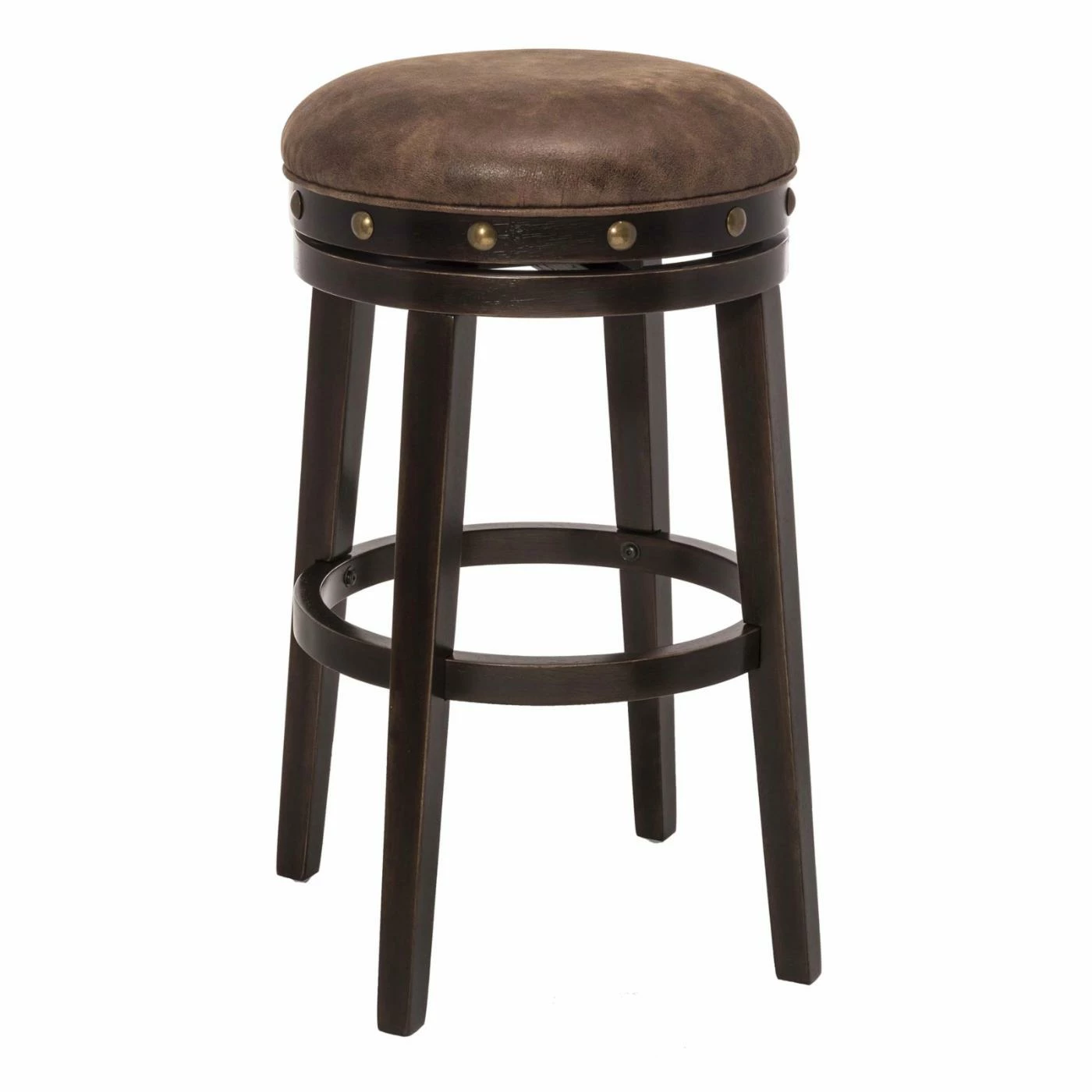 Boasting a classic, streamlined style, the Hillsdale Benard Backless Counter Stool brings a timeless appeal and additional seating to your home. Crafted from wood with a deep smoke brown finish, this backless, swivel counter stool features a softly cushioned, faux leather seat highlighted with bronze-hued stud detailing around the edge. The circular footrest lends stability and convenience to this chic and simple stool.