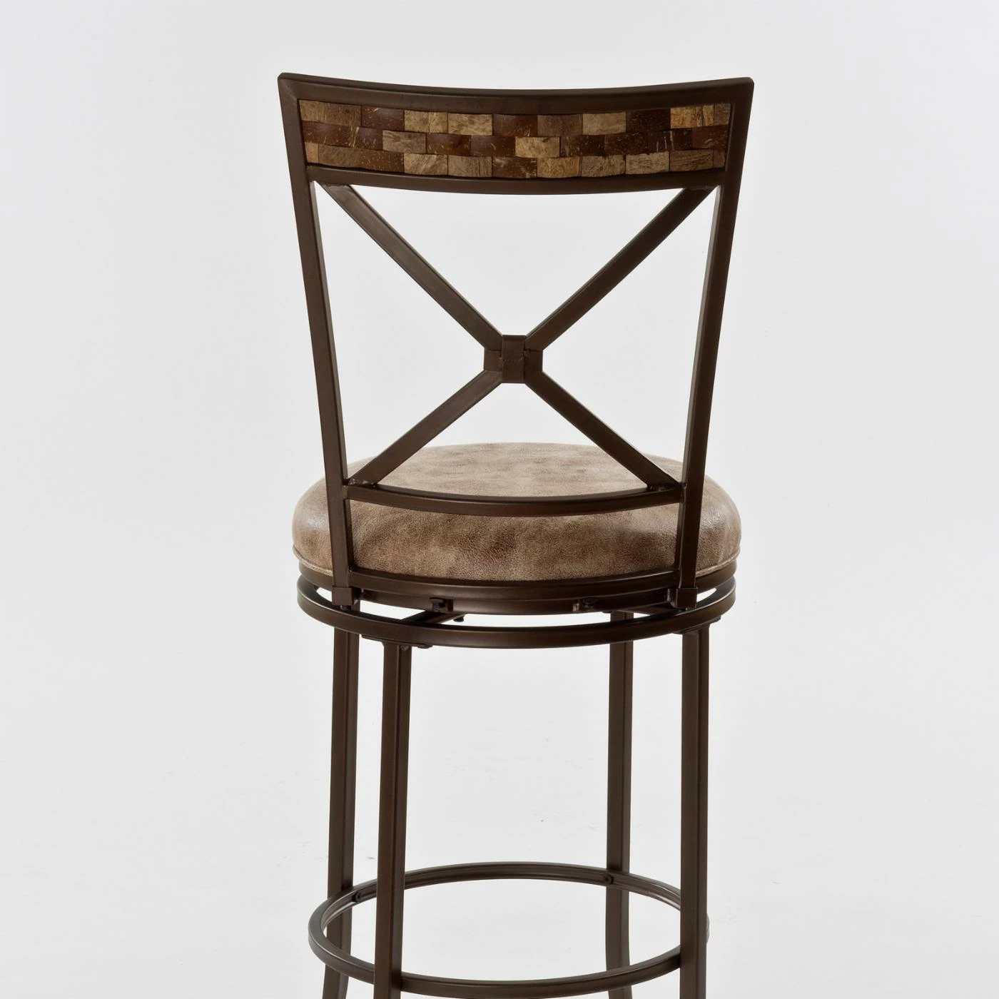 The Hillsdale Furniture Compton Swivel Counter Stool is made with earthy, natural tones and materials that complement almost any decor. With its simple brown finish and light, accenting fabric, this stool puts the focus on its coconut shell panel top, woven together from a series of neutral shell pieces, and an airy cross-back. The 360 degree swivel makes chatting and getting on and off the stool simple. Some assembly required.