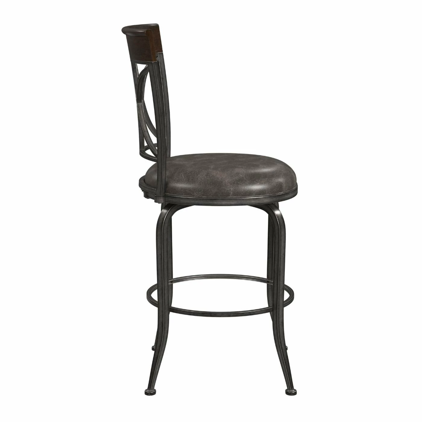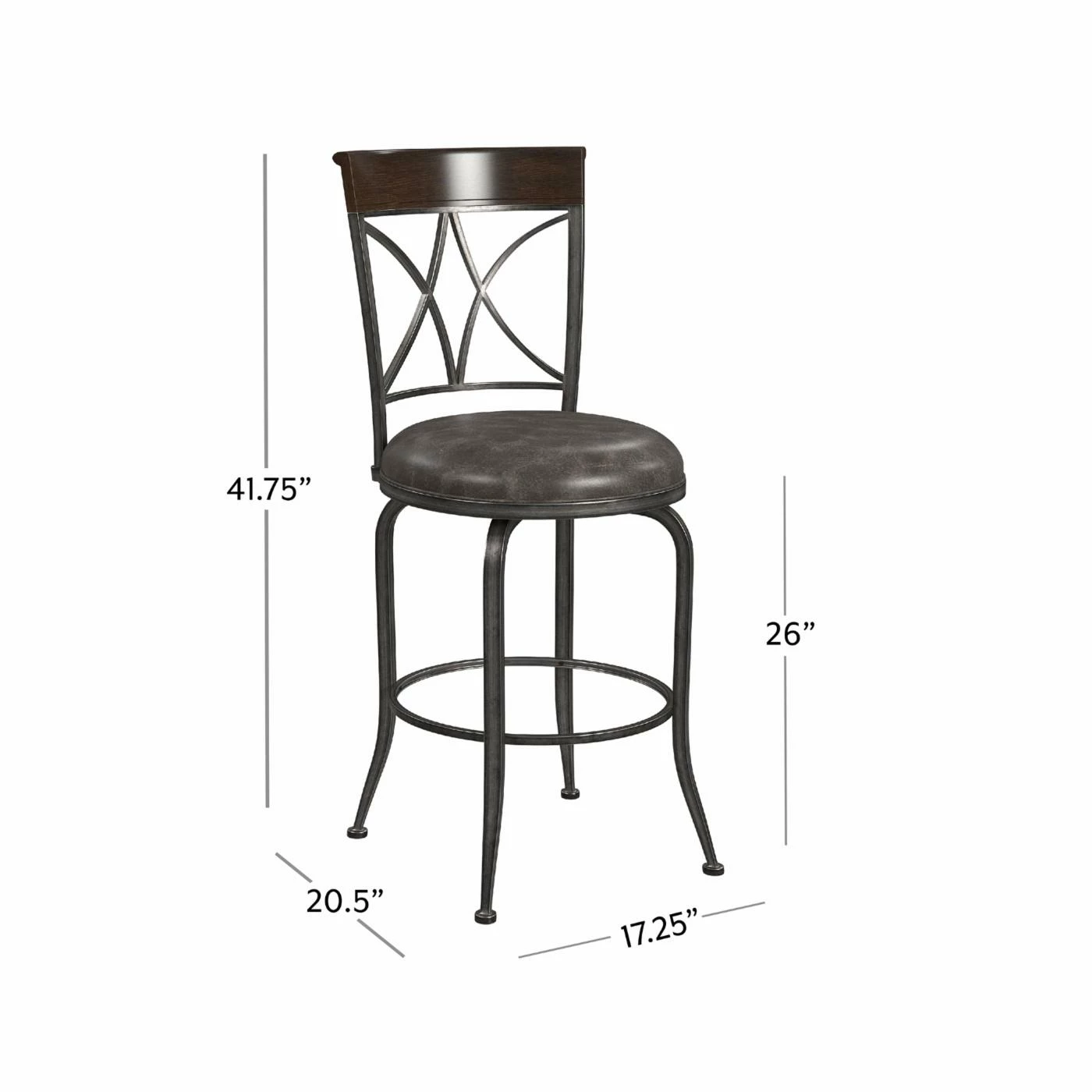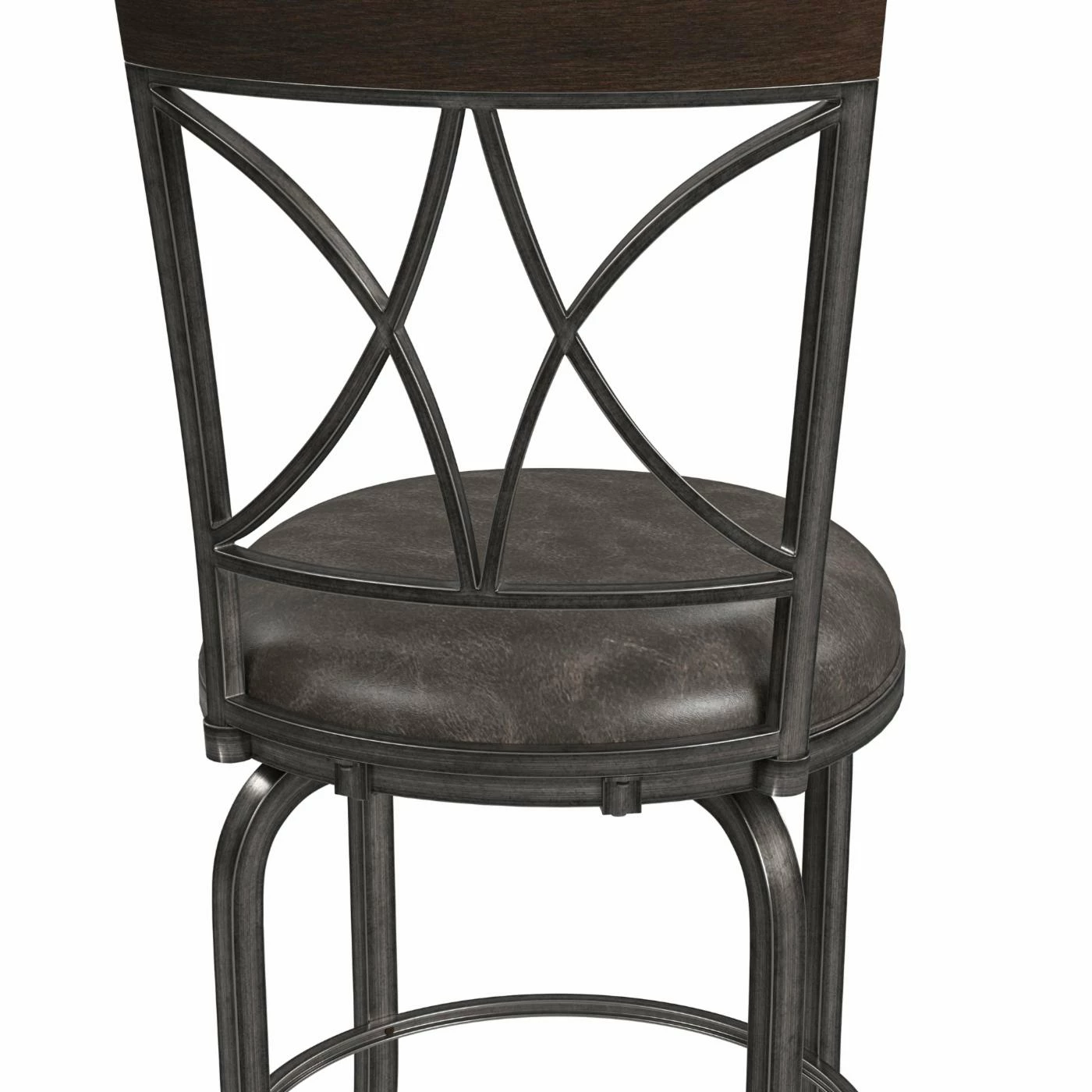 Invite the Hillsdale Killona Swivel Counter Stool into your home for an ideal perch to service your tall table or countertop. Sitting on four gently curving legs, the stool is constructed from solid metal and is finished with an antique pewter. The seat is easily accessible thanks to a complete 360-degree swivel and a round footrest. A curved rail slat design decorates the armless seat back, capped by a piece of gray-finished wood. The round seat comes padded with dense foam and is upholstered in a handsome gray polyurethane leather.