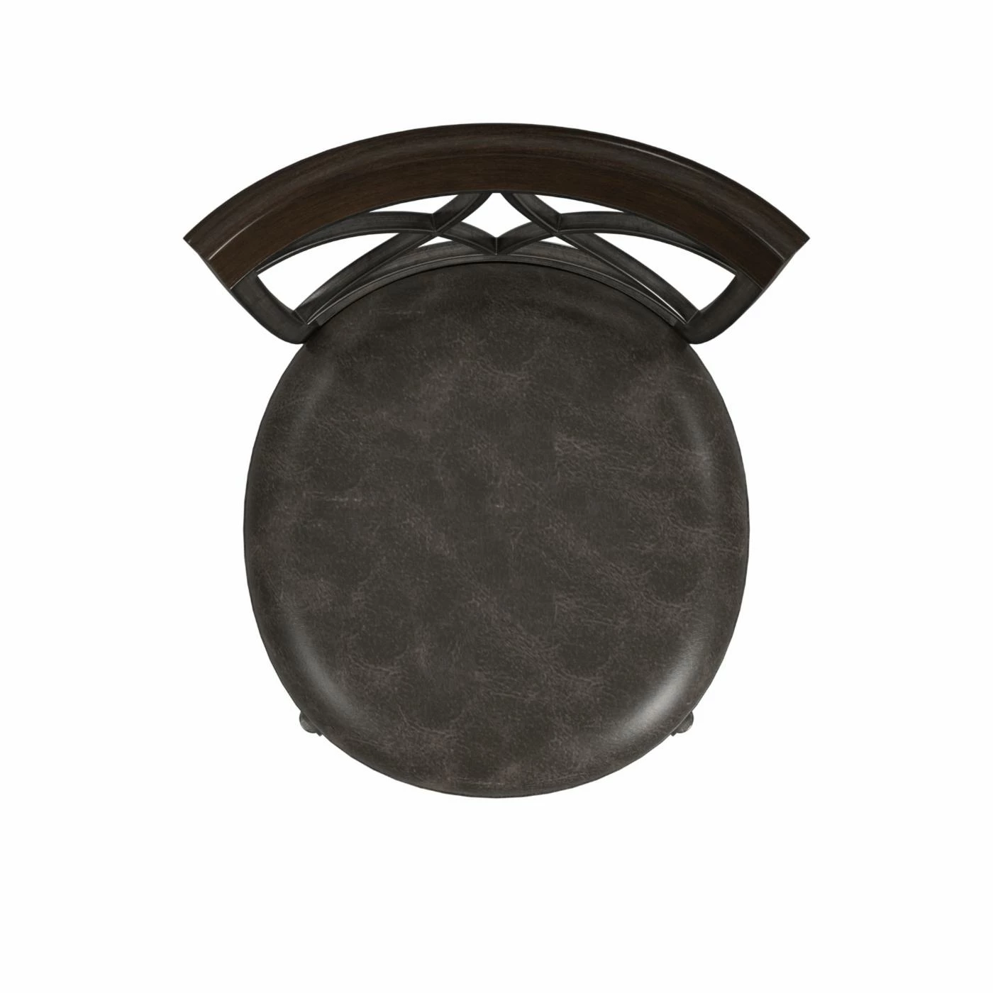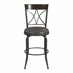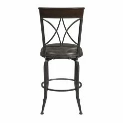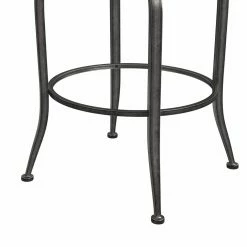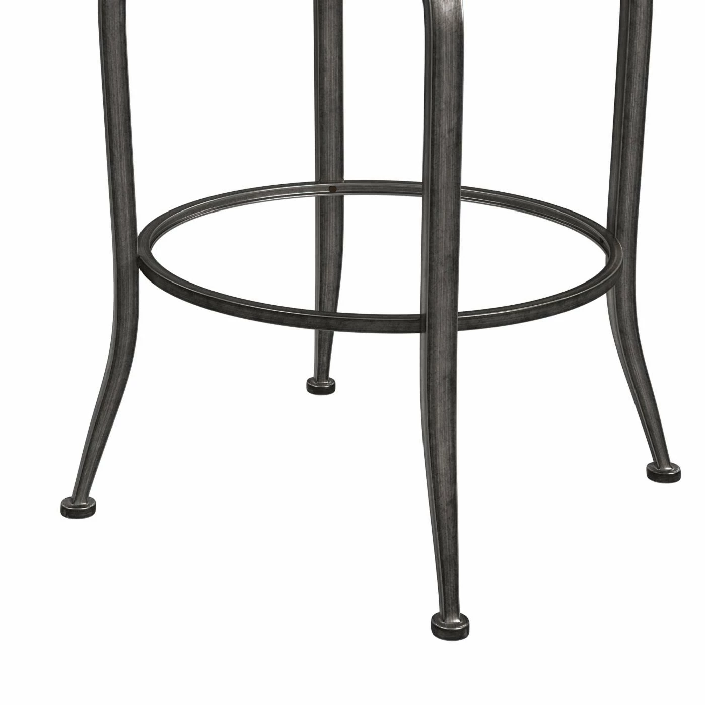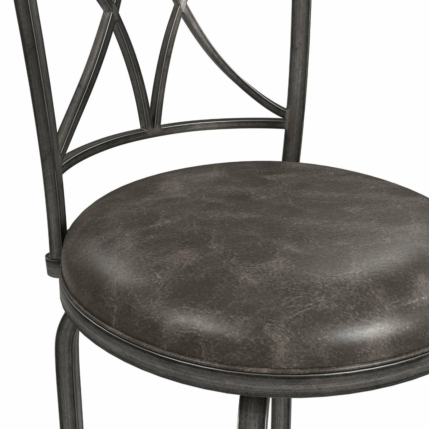 Invite the Hillsdale Killona Swivel Counter Stool into your home for an ideal perch to service your tall table or countertop. Sitting on four gently curving legs, the stool is constructed from solid metal and is finished with an antique pewter. The seat is easily accessible thanks to a complete 360-degree swivel and a round footrest. A curved rail slat design decorates the armless seat back, capped by a piece of gray-finished wood. The round seat comes padded with dense foam and is upholstered in a handsome gray polyurethane leather.