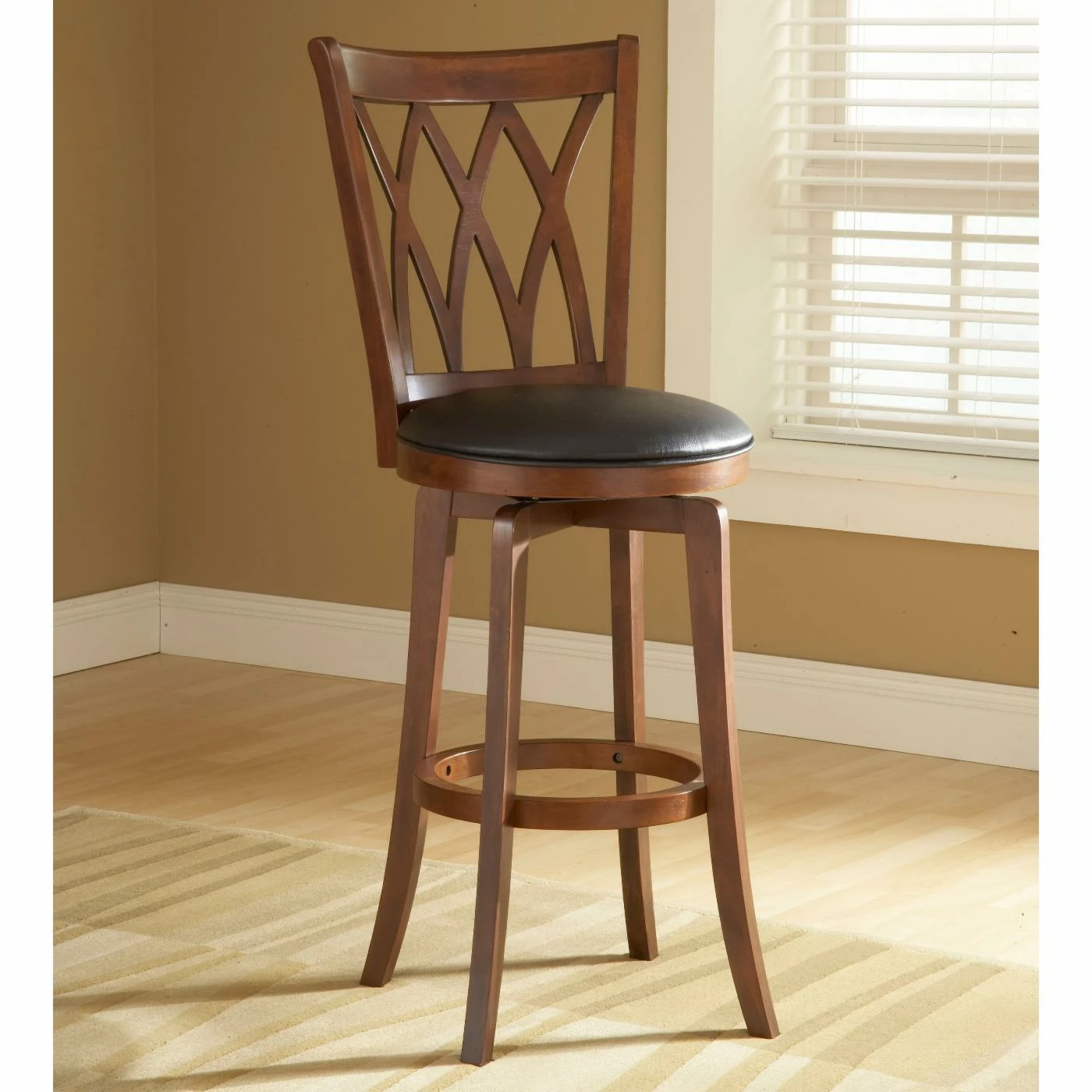 The Mansfield Swivel Counter Stool offers a clean, sleek, modern look with a hint of classic elegance. Its lattice-inspired spindle back and handsome faux-leather seat perfectly complement the brown cherry finish. This stool offers a balanced base, smooth swivel, and comfy seat; you won’t mind spending time enjoying your newly updated counter area. Please note: This item is not intended for commercial use. Warranty applies to residential use only.