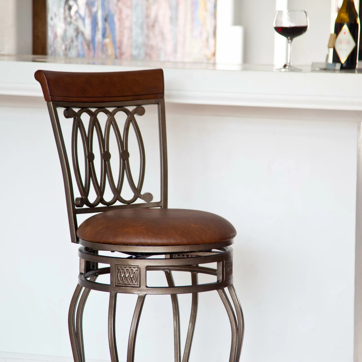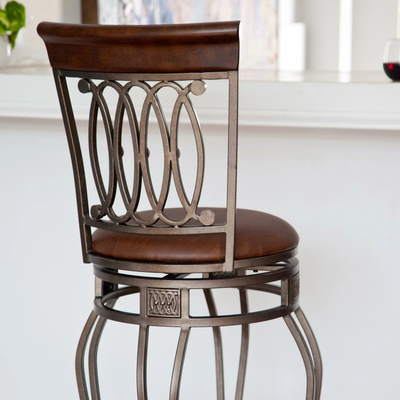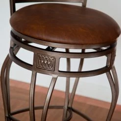 Add a touch of grace to your kitchen, breakfast nook, or other dining area with the Hillsdale Montello 30 in. Swivel Counter Stool. Crafted from metal and highlighted with cherry wood accents at the top of the backrest, this bar stool is a positively striking addition. The steel frame features sweeping interlocking circles, intricate castings, and double-arched steel rod legs. The rolled backrest finishes the chair with a flourish. The seat has a swivel mechanism to allow rotation of 360 degrees.