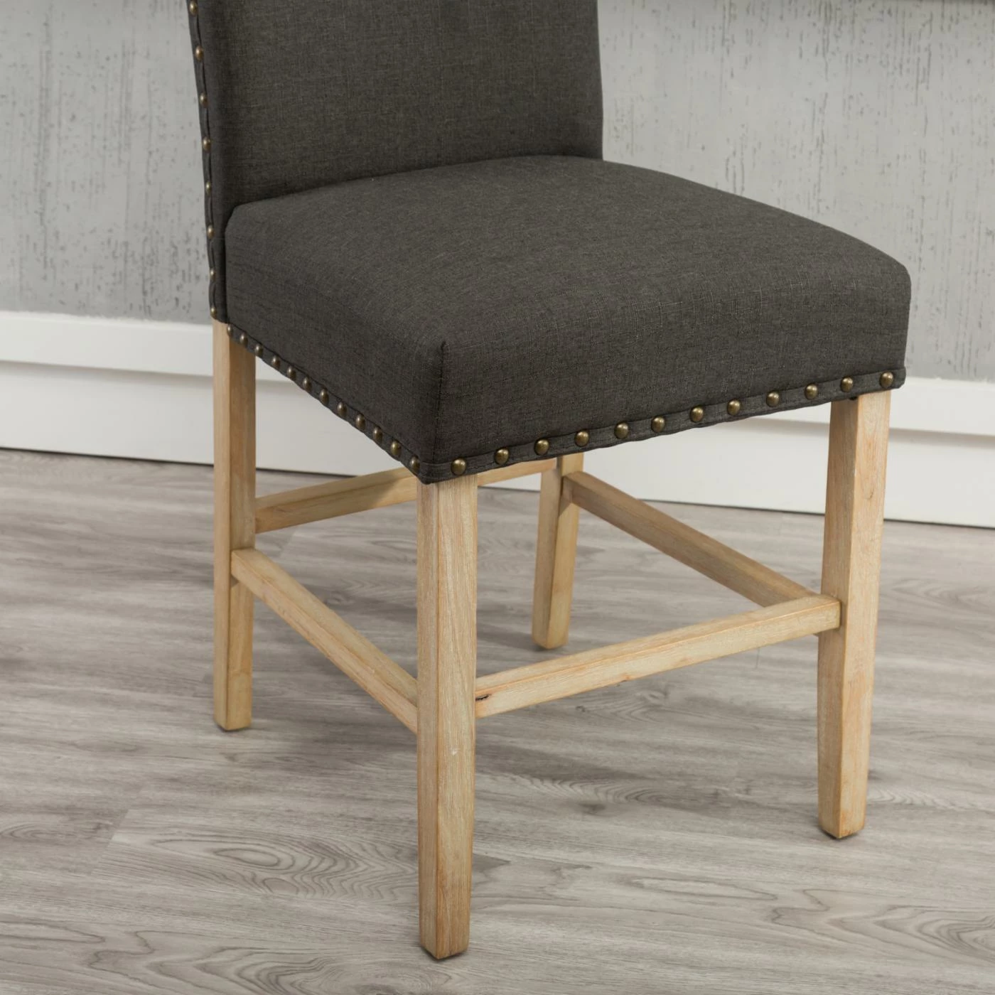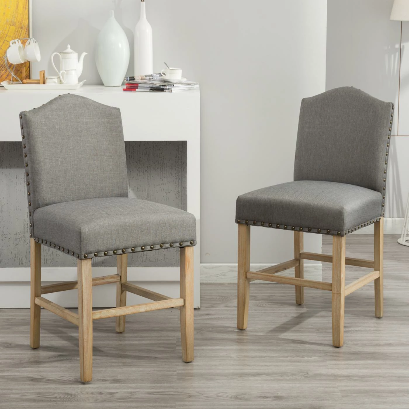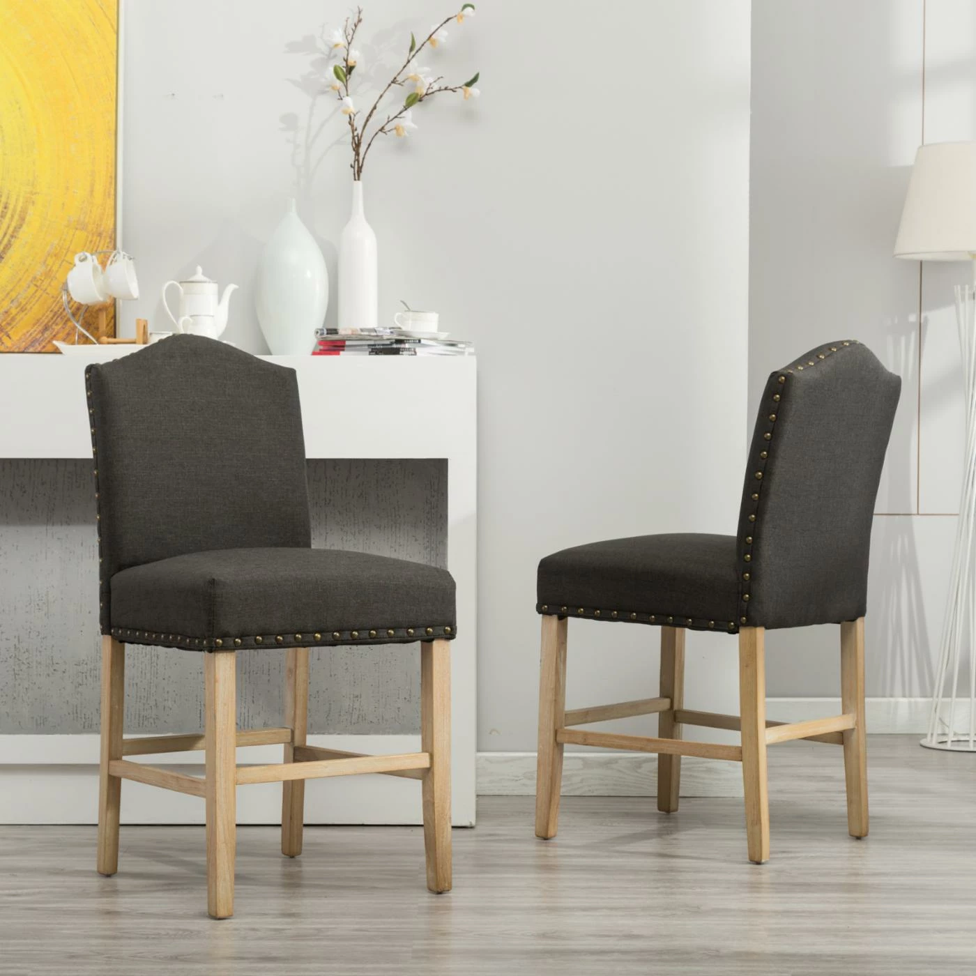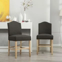 The Roundhill Furniture Mod Urban Counter Height Stools – Set of 2 features an arching upper edge that lends a regal touch to your living space. This set of stools flows with a clean, armless design and high, solid back for support. The framing is crafted of durable, sturdy wood with a natural brown finish. The soft fabric upholstery is decorated with nail head trim.